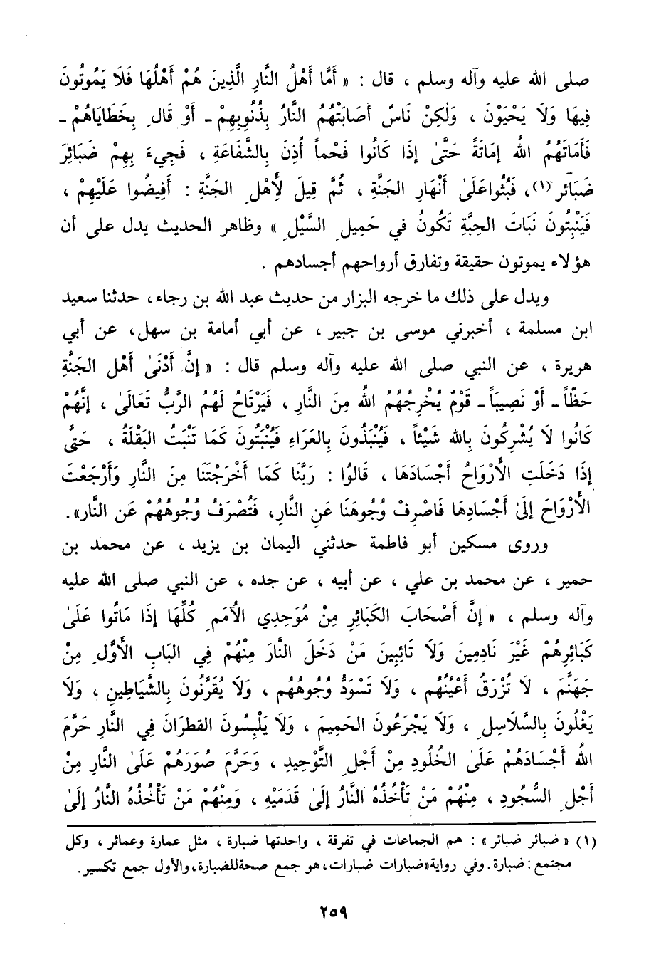 صلى الله عليه وآله وسلم، قال: أما أهل النار، الذين هم أهلها، فلا يموتون فيها ولا يحيون، ولكن ناس أصابتهم النار بذنوبهم ـ أو قال بخطاياهم ـ فأماتهم الله إماتة، حتى إذا كانوا فحماً، أذن في الشفاعة، فجيء بهم ضبابير ضبابير، فبثوا على أنهار الجنة، ثم قيل لأهل الجنة: أفيضوا عليهم، فينبتون نبات الحبة في حميل السيل» .