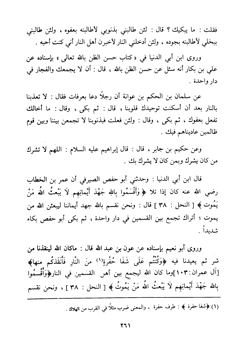 وعن سلمان بن الحكم بن عوانة، أن رجلاً دعا بعرفات، فقال: لا تعذبنا بالنار بعد أن أسكنت توحيدك قلوبنا، قال: ثم بكى، وقال: ما إخالك تفعل بعفوك، ثم بكى، وقال: ولئن فعلت: فبذنوبنا.