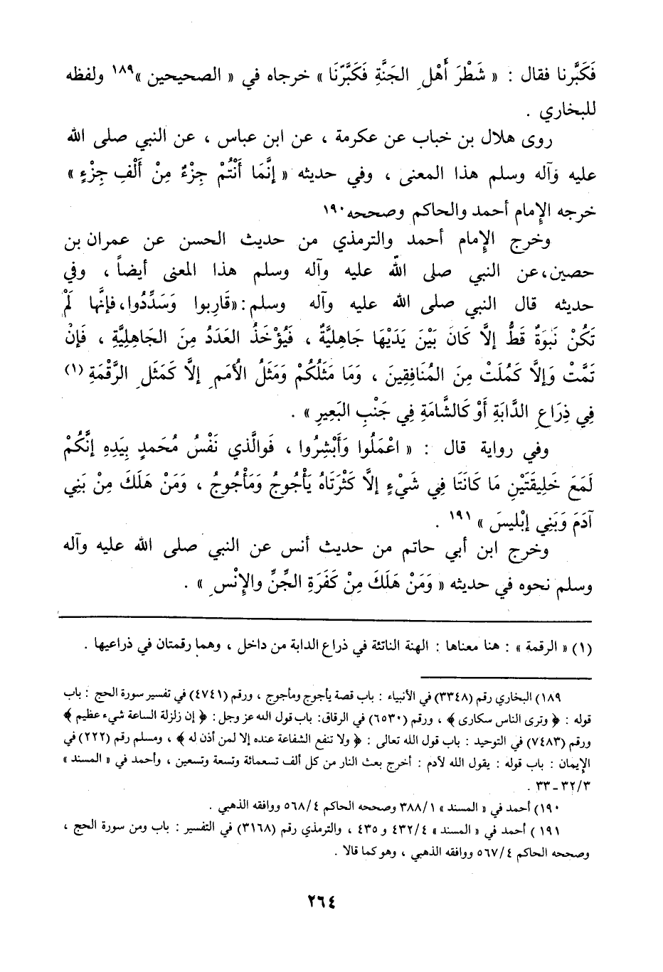 فكبرنا، فقال: شطر أهل الجنة، فكبرنا» ، خرجاه في الصحيحين، ولفظه البخاري.