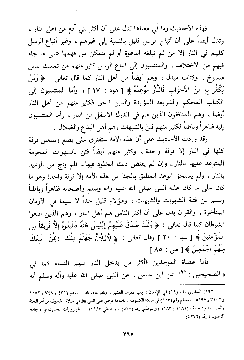 وقد وردت الأحاديث على أن هذه الأمة ستفترق على بضع وسبعين فرقة، كلها في النار إلا فرقة واحدة، وكثير منهم أيضاً فتن بالشهوات المحرمة المتوعد عليها بالنار ـ وإن لم يقتض ذلك الخلود فيها ـ فلم ينج من الوعيد بالنار، ولم يستحق الوعد المطلق بالجنة من هذه الأمة، إلا فرقة واحدة، وهو ما كان على ما كان عليه النبي صلى الله عليه وآله وسلم وأصحابه ظاهراً وباطناً، وسلم من فتنة الشهوات والشبهات، وهؤلاء قليل جداً، لا سيما في الأزمان المتأخرة والقرآن يدل على أن أكثر الناس هم أهل النار، وهم الذين اتبعوا الشيطان، كما قال تعالى: