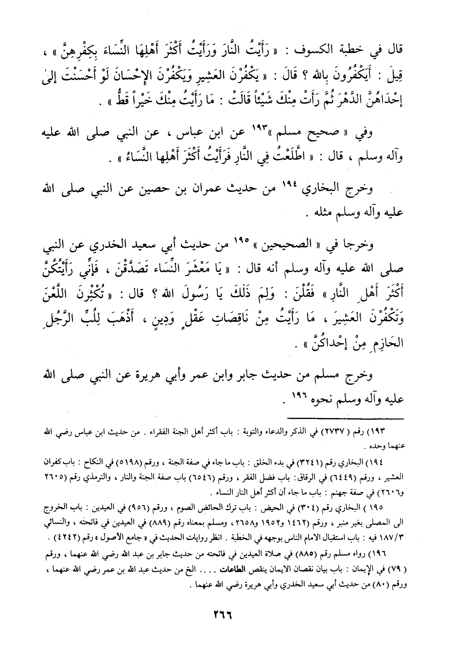 وفي صحيح مسلم «عن ابن عباس، عن النبي صلى الله عليه وآله وسلم، قال: اطلعت في النار فرأيت أكثر أهلها النساء» .