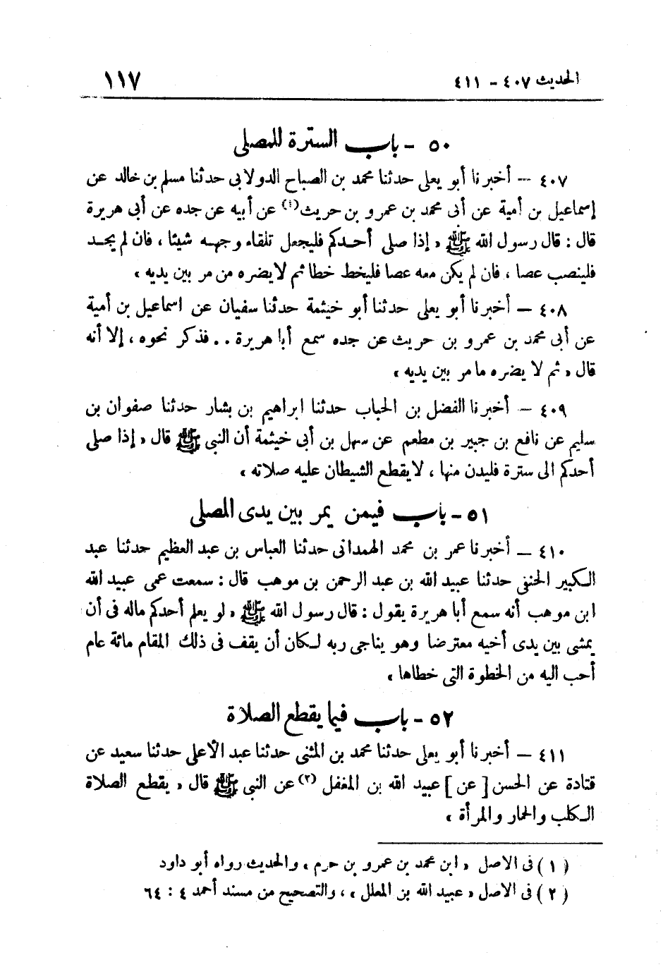 407- أَخْبَرَنَا أَبُو يَعْلَى حَدَّثَنَا مُحَمَّدُ بْنُ الصَّبَّاحِ الدولابي حَدَّثَنَا مُسْلِمُ بْنُ خَالِدٍ عَنْ إِسْمَاعِيلَ بْنِ أُمَيَّةَ عَنْ أَبِي مُحَمَّدِ بْنِ عَمْرِو بْنِ حُرَيْثٍ1 عَنْ أَبِيهِ عَنْ جَدِّهِ عَنْ أَبِي هُرَيْرَةَ قَالَ قَالَ رَسُولُ اللَّهِ صَلَّى اللهُ عَلَيْهِ وَسَلَّمَ: "إِذَا صَلَّى أَحَدُكُمْ فَلْيَجْعَلْ تِلْقَاءَ وَجهه شَيْئا فَإِن لم يجد فَلْيَنْصِبْ عَصًا فَإِنْ لَمْ يَكُنْ مَعَهُ عَصًا فَلْيَخُطَّ خَطًّا ثُمَّ لَا يَضُرُّهُ مَنْ مَرَّ بَين يَدَيْهِ".