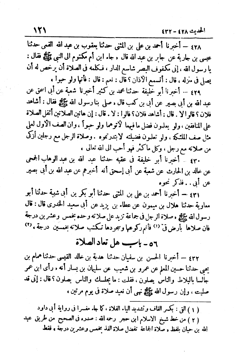 432- أَخْبَرَنَا الْحَسَنُ بْنُ سُفْيَانَ حَدَّثَنَا هُدْبَةُ بْنُ خَالِدٍ الْقَيْسِيُّ حَدَّثَنَا هُمَامُ بْنُ يَحْيَى حَدَّثَنَا حُسَيْنٌ الْمُعَلِّمُ عَنْ عَمْرِو بْنِ شُعَيْبٍ عَنْ سُلَيْمَانَ بْنِ يَسَارٍ أَنَّهُ رَأَى ابْنَ عُمَرَ جَالِسًا بِالْبَلاطِ وَالنَّاسُ يُصَلُّونَ فَقُلْتُ مَا يُجْلِسُكَ وَالنَّاسُ يُصَلُّونَ قَالَ إِنِّي قَدْ صَلَّيْتُ وَإِنَّ رَسُولَ اللَّهِ صَلَّى اللهُ عَلَيْهِ وَسَلَّمَ نَهَى أَن نعيد صَلَاة فِي يَوْم مرَّتَيْنِ.