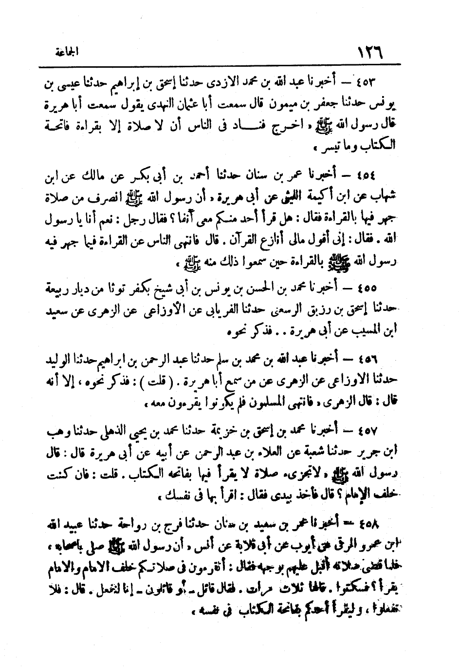 454- أخبرنَا عمر بْنِ سِنَانٍ حَدَّثَنَا أَحْمَدُ بْنُ أَبِي بَكْرٍ عَنْ مَالِكٍ عَنِ ابْنِ شِهَابٍ عَنِ ابْنِ أُكَيْمَةَ اللَّيْثِيِّ عَنْ أَبِي هُرَيْرَةَ أَنّ رَسُولَ اللَّهِ صَلَّى اللهُ عَلَيْهِ وَسَلَّمَ انْصَرَفَ مِنْ صَلاةٍ جَهَرَ فِيهَا بِالْقِرَاءَةِ فَقَالَ: "هَلْ قَرَأَ أحد مِنْكُم معي آنِفًا" فَقَالَ رَجُلٌ نَعَمْ أَنَا يَا رَسُولَ الله فَقَالَ: "إِنِّي أَقُولُ مَا لِي أُنَازَعُ الْقُرْآنَ" قَالَ فَانْتَهَى النَّاسُ عَنِ الْقِرَاءَةِ فِيمَا جَهَرَ فِيهِ رَسُولُ اللَّهِ صَلَّى اللهُ عَلَيْهِ وَسَلَّمَ بِالْقِرَاءَةِ حِين سمعُوا ذَلِك مِنْهُ صَلَّى اللهُ عَلَيْهِ وَسَلَّمَ.