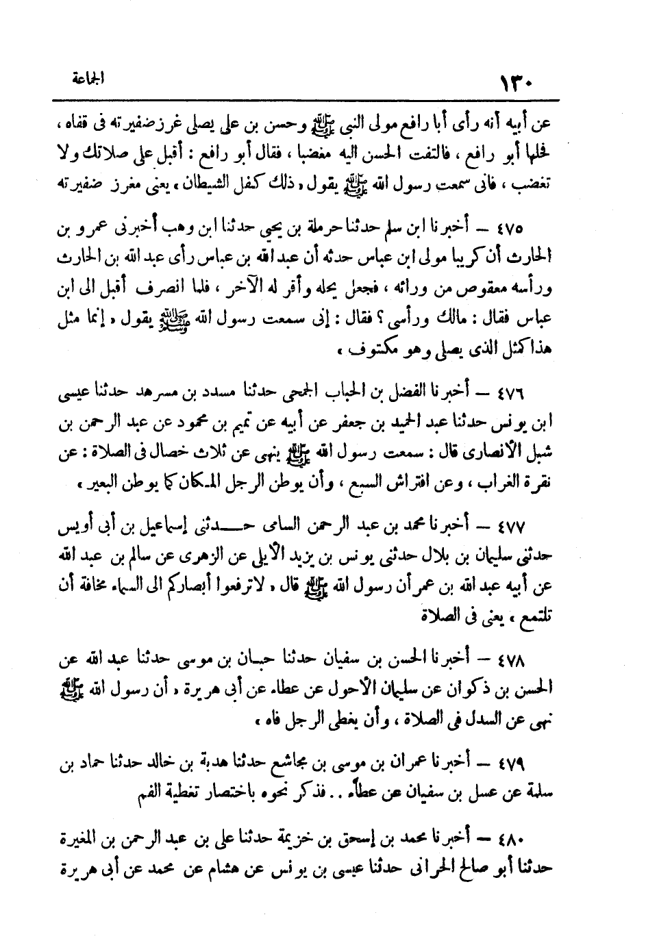 475- أَخْبَرَنَا ابْنُ سَلْمٍ حَدَّثَنَا حَرْمَلَةُ بْنُ يَحْيَى حَدَّثَنَا ابْنُ وَهْبٍ أَخْبَرَنِي عَمْرُو بْنُ الْحَارِثِ أَنَّ كُرَيْبًا مَوْلَى ابْنِ عَبَّاسٍ حَدَّثَهُ أَنَّ عَبْدَ اللَّهِ بْنَ عَبَّاسٍ رَأَى عَبْدَ اللَّهِ بن الْحَارِث وَرَأسه معقوص مِنْ وَرَائِهِ فَجَعَلَ يَحُلُّهُ وَأَقَرَّ لَهُ الآخَرُ فَلَمَّا انْصَرَفَ أَقْبَلَ إِلَى ابْنِ عَبَّاسٍ فَقَالَ مَالك وَرَأْسِي فَقَالَ إِنِّي سَمِعْتُ رَسُولَ اللَّهِ صَلَّى اللهُ عَلَيْهِ وَسَلَّمَ يَقُولُ: "إِنَّمَا مَثَلُ هَذَا كَمثل الَّذِي يُصَلِّي وَهُوَ مكتوف".