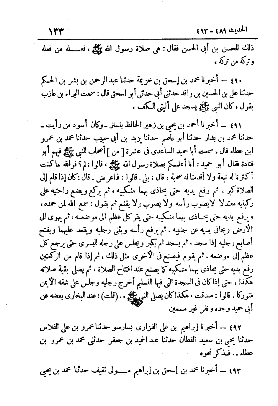 490- أَخْبَرَنَا مُحَمَّدُ بْنُ إِسْحَاقَ بْنِ خُزَيْمَةَ حَدَّثَنَا عَبْدُ الرَّحْمَنِ بْنُ بِشْرِ بْنِ الْحَكَمِ حَدَّثَنَا عَلِيُّ بْنُ الْحُسَيْنِ بْنِ وَاقِدٍ حَدَّثَنِي أَبِي حَدثنِي أَبُو إِسْحَاق قَالَ سَمِعت الْبَراء بن عَازِب يَقُولُ كَانَ النَّبِيُّ صَلَّى اللهُ عَلَيْهِ وَسَلَّمَ يسْجد على أليتي الْكَفّ.