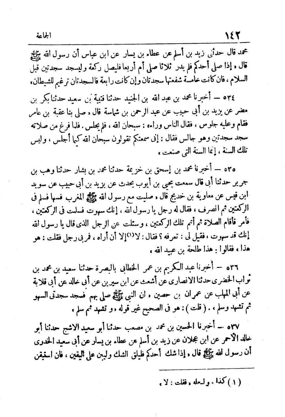 537- أَخْبَرَنَا الْحُسَيْنُ بْنُ مُحَمَّدِ بْنِ مُصْعَبٍ حَدَّثَنَا أَبُو سَعِيدٍ الأَشَجُّ حَدَّثَنَا أَبُو خَالِدٍ الأَحْمَرُ عَنِ ابْنِ عَجْلانَ عَنْ زَيْدِ بْنِ أَسْلَمَ عَنْ عَطَاءِ بْنِ يَسَارٍ عَنْ أَبِي سَعِيدٍ الْخُدْرِيِّ أَنّ رَسُولَ اللَّهِ صَلَّى اللهُ عَلَيْهِ وَسَلَّمَ قَالَ: "إِذَا شكّ أحدكُم فَلْيُلْقِ الشَّكَّ وَلْيَبْنِ عَلَى الْيَقِينِ فَإِنِ اسْتَيْقَنَ