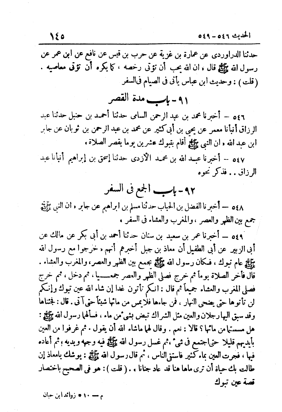 546- أَخْبَرَنَا مُحَمَّدُ بْنُ عَبْدِ الرَّحْمَنِ السَّامِيُّ حَدَّثَنَا أَحْمَدُ بْنُ حَنْبَلٍ حَدَّثَنَا عَبْدُ الرَّزَّاقِ أَنْبَأَنَا مَعْمَرٍ عَنْ يَحْيَى بْنِ أَبِي كَثِيرٍ عَنْ مُحَمَّدِ بْنِ عَبْدِ الرَّحْمَنِ بْنِ ثَوْبَانَ عَنْ جَابِرِ بْنِ عَبْدِ اللَّهِ أَنّ النَّبِيَّ صَلَّى اللهُ عَلَيْهِ وَسَلَّمَ أَقَامَ بِتَبُوكَ عِشْرِينَ يَوْمًا يقصر الصَّلاةَ.