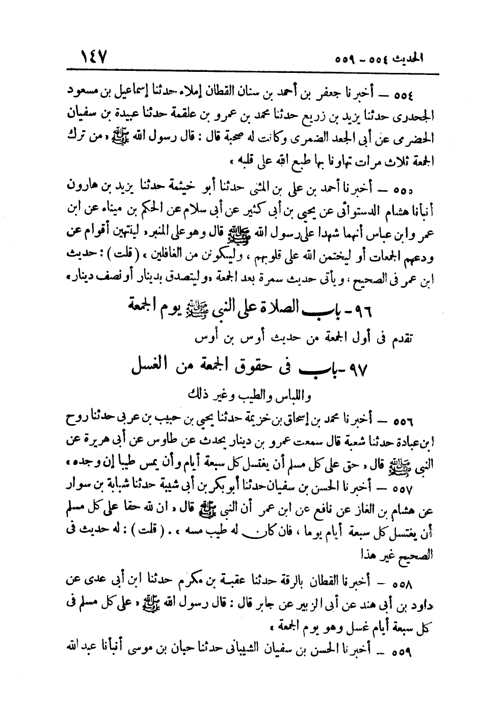 558- أخبرنَا الْقطَّان بالرقة حَدثنَا عقبَة بن مكرم حَدَّثَنَا ابْنُ أَبِي عَدِيٍّ عَنْ دَاوُدَ بْنِ أبي هِنْد عَنْ أَبِي الزُّبَيْرِ عَنْ جَابِرٍ قَالَ قَالَ رَسُولُ اللَّهِ صَلَّى اللهُ عَلَيْهِ وَسَلَّمَ: "عَلَى كُلِّ مُسْلَمْ فِي كُلِّ سَبْعَةِ أَيَّام غسل وَهُوَ يَوْم الْجُمُعَة".