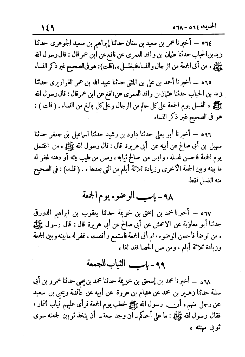 564- أَخْبَرَنَا عُمَرُ بْنُ سَعِيدِ بْنِ سِنَانٍ حَدَّثَنَا إِبْرَاهِيم بن سعيد الْجَوْهَرِي حَدثنَا زيد بن الْحباب حَدَّثَنَا عُثْمَانُ بْنُ وَاقِدٍ الْعُمَرِيُّ عَنْ نَافِعٍ عَنِ ابْنِ عُمَرَ قَالَ قَالَ رَسُولُ اللَّهِ صَلَّى اللهُ عَلَيْهِ وَسَلَّمَ: "مَنْ أَتَى الْجُمُعَةَ من الرِّجَال وَالنِّسَاء فليغتسل". قلت هُوَ فِي الصَّحِيح غير ذكر النِّسَاءِ.