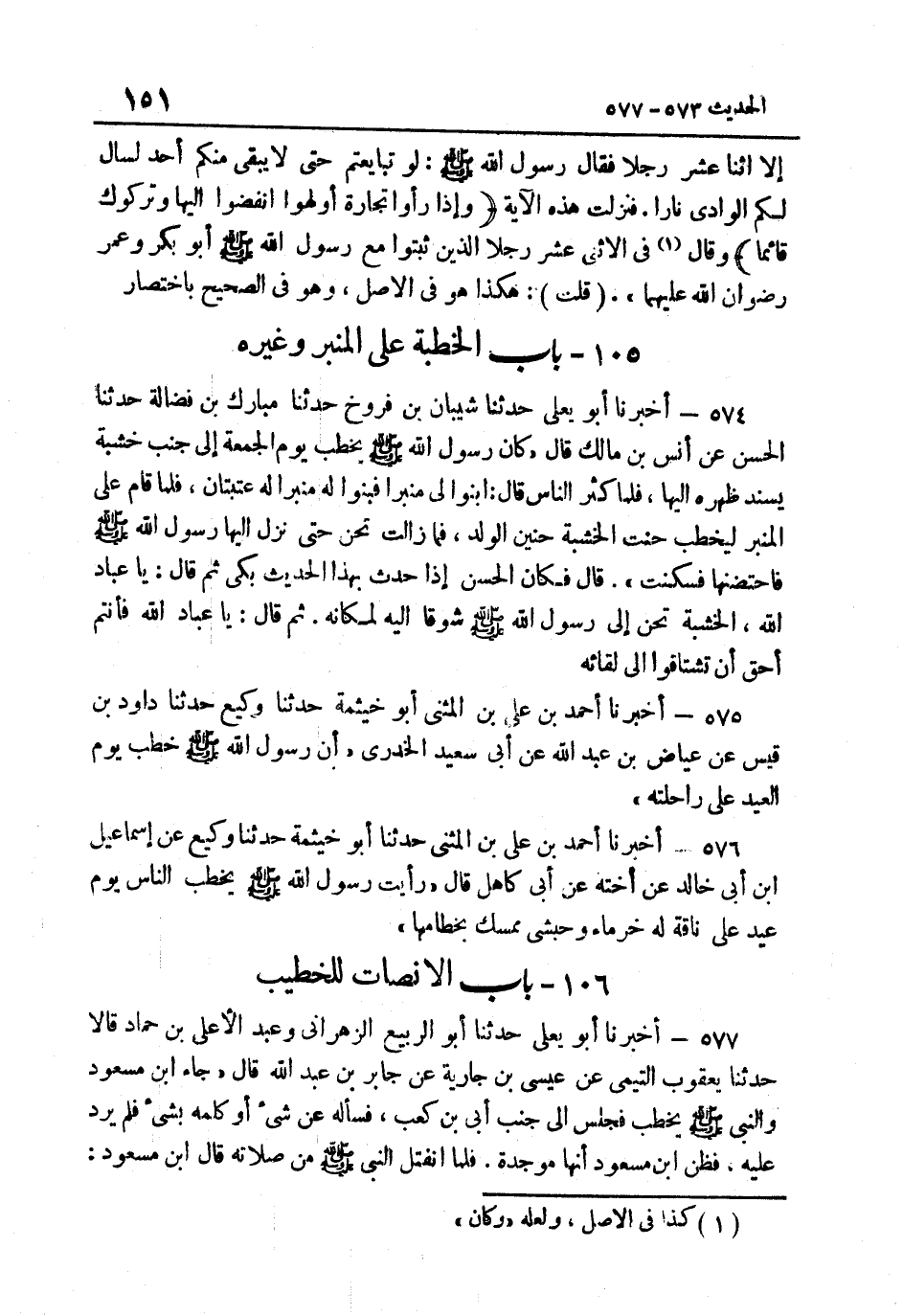 574- أَخْبَرَنَا أَبُو يَعْلَى حَدَّثَنَا شَيْبَانُ بْنُ فَرُّوخٍ حَدثنَا مبارك بن فضَالة حَدَّثَنَا الْحَسَنُ عَنْ أَنَسِ بْنِ مَالِكٍ قَالَ كَانَ رَسُولُ اللَّهِ صَلَّى اللهُ عَلَيْهِ وَسَلَّمَ يَخْطُبُ يَوْمَ الْجُمُعَةِ إِِلَى جَنْبِ خَشَبَةٍ يُسْنِدُ ظَهْرَهُ إِِلَيْهَا فَلَمَّا كَثُرَ النَّاسُ قَالَ ابْنُوا لي منبرا فبنوا لَهُ منبرا لَهُ عَتَبَتَانِ فَلَمَّا قَامَ عَلَى الْمِنْبَرِ لِيَخْطُبَ حَنَّتِ الْخَشَبَة حَنِينَ الْوَلَدِ فَمَا زَالَتْ تَحِنُّ حَتَّى نَزَلَ إِِلَيْهَا رَسُولُ اللَّهِ صَلَّى اللهُ عَلَيْهِ وَسَلَّمَ فاحتضنها فسكنت قَالَ فَكَانَ الْحَسَنُ إِِذَا حَدَّثَ بِهَذَا الْحَدِيثِ بَكَى ثُمَّ قَالَ يَا عِبَادَ اللَّهِ الْخَشَبَةُ تَحِنُّ إِِلَى رَسُولِ اللَّهِ صَلَّى اللهُ عَلَيْهِ وَسَلَّمَ شَوْقًا إِلَيْهِ لمكانه ثمَّ قَالَ يَا عباد اللَّهِ فَأَنْتُمْ أَحَقُّ أَنْ تَشْتَاقُوا إِِلَى لِقَائِهِ.