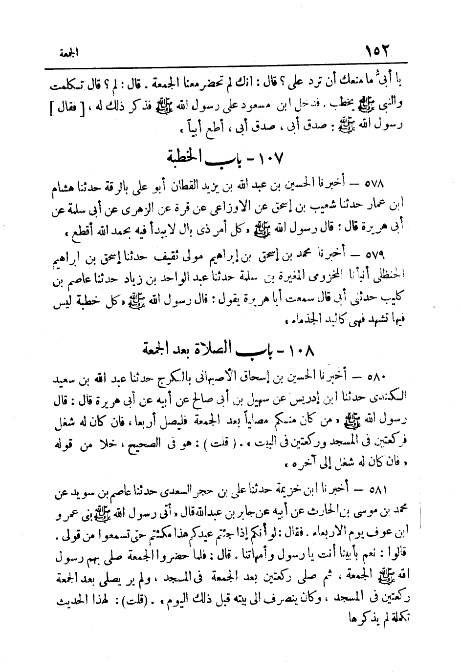 يَا أُبَيُّ مَا مَنَعَكَ أَنْ تَرُدَّ عَلَيَّ قَالَ إِنَّكَ لَمْ تَحْضُرْ مَعَنَا الْجُمُعَةَ قَالَ لم قَالَ تَكَلَّمْتَ وَالنَّبِيُّ صَلَّى اللهُ عَلَيْهِ وَسَلَّمَ يخْطب فَدخل ابْنِ مَسْعُودٍ عَلَى رَسُولِ اللَّهِ صَلَّى اللهُ عَلَيْهِ وَسَلَّمَ فَذكر ذَلِكَ لَهُ فَقَالَ رَسُولُ اللَّهِ صَلَّى اللهُ عَلَيْهِ وَسَلَّمَ: "صدق أبي صدق أبي أطع أَبَيَا".