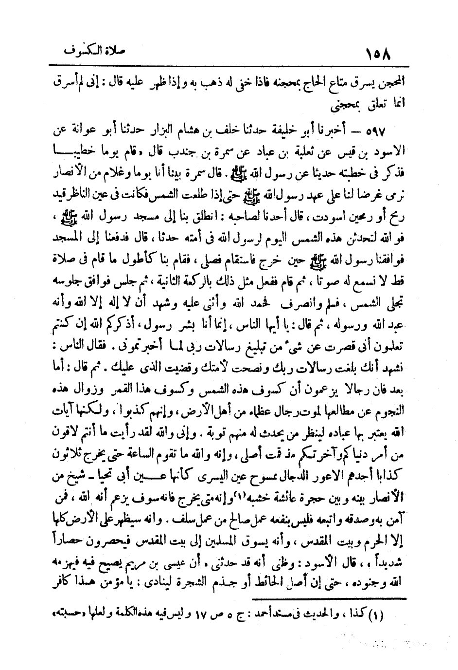 597- أخبرنَا أَبُو خَليفَة حَدثنَا خلف بن هِشَام الْبَزَّار حَدَّثَنَا أَبُو عَوَانَةَ عَنِ الأَسْوَدِ بْنِ قَيْسٍ عَنْ ثَعْلَبَةَ بْنِ عَبَّادٍ عَنْ سَمُرَةَ بْنِ جُنْدُبٍ قَالَ قَامَ يَوْمًا خَطِيبًا فَذَكَرَ فِي خُطْبَتِهِ حَدِيثًا عَنْ رَسُولِ اللَّهِ صَلَّى اللهُ عَلَيْهِ وَسَلَّمَ قَالَ سَمُرَة بَينا أَنَا يَوْمًا وَغُلامٌ مِنَ الأَنْصَارِ نَرْمِي غَرَضًا لَنَا عَلَى عَهْدِ رَسُولِ اللَّهِ صَلَّى اللهُ عَلَيْهِ وَسَلَّمَ حَتَّى إِذَا طَلَعَتِ الشَّمْسُ فَكَانَتْ فِي عَيْنِ النَّاظِرِ قِيدَ رُمْحٍ أَوْ رُمْحَيْنِ اسودت قَالَ أَحَدُنَا لِصَاحِبِهِ انْطَلَقَ بِنَا إِلَى مَسْجِدِ رَسُولِ اللَّهِ صَلَّى اللهُ عَلَيْهِ وَسَلَّمَ فَوَاللَّهِ لَتُحْدِثَنَّ هَذِهِ الشَّمْسُ الْيَوْمَ لِرَسُولِ اللَّهِ فِي أُمَّتِهِ حَدثا قَالَ فَدَفَعْنَا إِلَى الْمَسْجِدِ فَوَافَقْنَا رَسُولَ اللَّهِ صَلَّى اللهُ عَلَيْهِ وَسَلَّمَ حِينَ خَرَجَ فَاسْتَقَامَ فَصَلَّى فَقَامَ بِنَا كَأَطْوَلِ مَا قَامَ فِي صَلاةٍ قَطُّ لَا نَسْمَعُ لَهُ صَوْتًا ثُمَّ قَامَ فَفَعَلَ مِثْلَ ذَلِكَ بِالرَّكْعَةِ الثَّانِيَةِ ثُمَّ جَلَسَ فَوَافَقَ جُلُوسَهُ تَجَلِّي الشَّمْسِ فَسَلَّمَ وَانْصَرَفَ فَحَمِدَ اللَّهَ وَأَثْنَى عَلَيْهِ وَشَهِدَ أَنْ لَا إِلَهَ إِلا اللَّهُ وَأَنَّهُ عَبْدُ اللَّهِ وَرَسُولُهُ ثمَّ قَالَ: "يَا أَيهَا النَّاس إِنَّمَا أَنا بشر رَسُول أذكركم الله إِنْ كُنْتُمْ تَعْلَمُونَ أَنِّي قَصَّرْتُ عَنْ شَيْءٍ من تَبْلِيغ رِسَالاتِ رَبِّي لَمَّا أَخْبَرْتُمُونِي" فَقَالَ النَّاسُ نَشْهَدُ أَنَّك بَلَّغْتَ رِسَالاتِ رَبِّكِ وَنَصَحْتَ لأُمَّتِكَ وَقَضَيْتَ الَّذِي عَلَيْكَ ثُمَّ قَالَ: "أَمَا بَعْدُ فَإِنَّ رِجَالا يَزْعُمُونَ أَنَّ كُسُوفَ هَذِهِ الشَّمْسِ وَكُسُوفَ هَذَا الْقَمَرِ وَزَوَالِ هَذِهِ النُّجُومِ عَنْ مَطَالِعِهَا لِمَوْتِ رِجَالٍ عُظَمَاءَ مِنْ أَهْلِ الأَرْضِ وَإِنَّهُمْ كَذَبُوا وَلَكِنَّهَا آيَاتُ اللَّهِ يَعْتَبِرُ بِهَا عِبَادُهُ لَيَنْظُرَ من يحدث لَهُ مِنْهُمْ تَوْبَةً وَإِنِّي وَاللَّهِ لَقَدْ رَأَيْتُ مَا أَنْتُم لاقون من أَمْرِ دُنْيَاكُمْ وَأَخِرَتِكُمْ مُذْ قُمْتُ أُصَلِّي وَإِنَّهُ وَاللَّهِ مَا تَقُومُ السَّاعَةُ حَتَّى يَخْرُجَ ثَلاثُونَ كَذَّابًا أَحَدُهُمُ الأَعْوَرُ الدَّجَّالُ مَمْسُوحُ عَيْنِ الْيُسْرَى كَأَنَّهَا عين أبي تحيا شَيْخٍ مِنَ الأَنْصَارِ بَيْنَهُ وَبَيْنَ حُجْرَةِ عَائِشَةَ خَشَبَةٌ1 وَإِنَّهُ مَتَى يَخْرُجُ فَإِنَّهُ سَوْفَ يَزْعُمُ أَنَّهُ اللَّهُ فَمَنْ آمَنَ بِهِ وَصَدَّقَهُ وَاتَّبَعَهُ فَلَيْسَ يَنْفَعُهُ عَمِلٌ صَالِحٌ مِنْ عَمِلٍ سَلَفَ وَإنَّهُ سَيظْهر على الأَرْض كلهَا إِلَّا الْحَرَمِ وَبَيْتِ الْمَقْدِسِ وَإِنَّهُ يَسُوقُ الْمُسْلِمِينَ إِلَى بَيت الْمُقَدّس فيحصرون حِصَارًا شَدِيدًا" قَالَ الأَسْوَدُ وَظَنِّي أَنَّهُ قَدْ حَدثنِي: "أَن عِيسَى بن مَرْيَمَ يَصِيحُ فِيهِ فَيَهْزِمُهُ اللَّهُ وَجُنُودَهُ حَتَّى إِنَّ أَصْلَ الْحَائِطِ أَوْ جِذْمَ الشَّجَرَةِ لَيُنَادِي يَا مُؤمن هَذَا كَافِر.