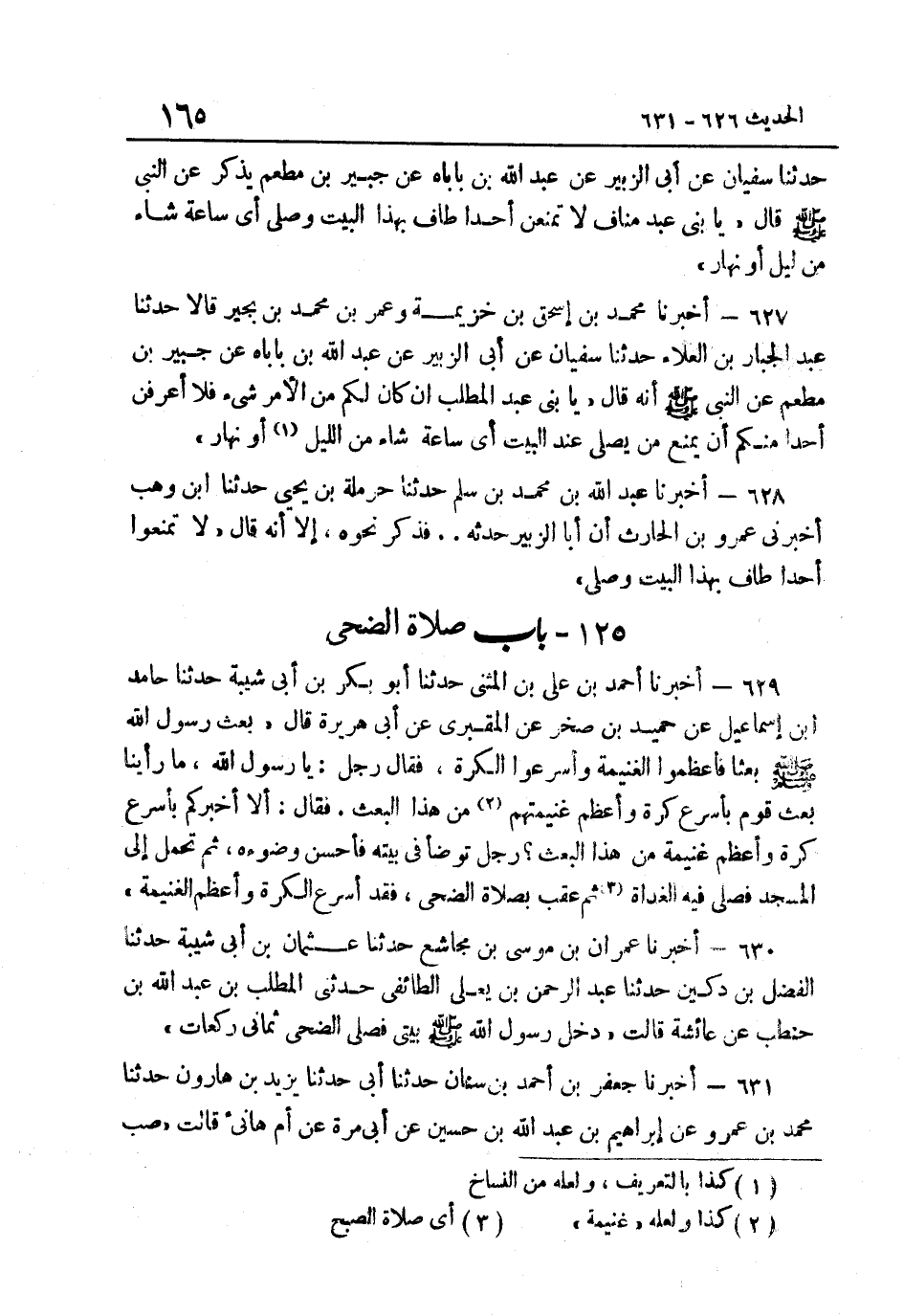 627- أَخْبَرَنَا مُحَمَّدُ بْنُ إِسْحَاقَ بْنِ خُزَيْمَةَ وَعُمَرُ بْنُ مُحَمَّدِ بْنِ بُجَيْرٍ قَالا حَدَّثَنَا عَبْدُ الْجَبَّارِ بْنُ الْعَلاءِ حَدَّثَنَا سُفِيانُ عَنْ أَبِي الزُّبَيْرِ عَنْ عَبْدِ اللَّهِ بْنِ بَابَاهَ عَنْ جُبَيْرِ بْنِ مُطْعِمٍ عَنِ النَّبِيِّ صَلَّى اللهُ عَلَيْهِ وَسَلَّمَ أَنَّهُ قَالَ: "يَا بَنِي عَبْدِ الْمُطَّلِبِ إِنْ كَانَ لكم من الْأَمر شَيْء فَلَا أَعرفن أحدا مِنْكُم أَنْ يَمْنَعَ مَنْ يُصَلِّي عِنْدَ الْبَيْتِ أَيَّ سَاعَة شَاءَ من اللَّيْل1 أَوْ نَهَارٍ".