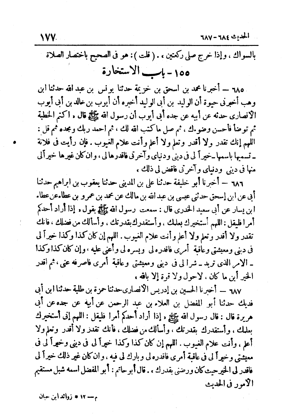 687- أخبرنَا الْحسن بن إِدْرِيس الْأنْصَارِيّ حَدثنَا حَمْزَة بن طلبة حَدثنَا ابْن أبي فديك حَدَّثَنَا أَبُو الْمُفَضَّلِ بْنُ الْعَلاءِ بْنِ عَبْدِ الرَّحْمَنِ عَنْ أَبِيهِ عَنْ جَدِّهِ عَنْ أَبِي هُرَيْرَةَ قَالَ قَالَ رَسُولُ اللَّهِ صَلَّى اللهُ عَلَيْهِ وَسَلَّمَ: "إِذَا أَرَادَ أَحَدُكُمْ أَمْرًا فَلْيَقُلِ اللَّهُمَّ إِنِّي أَسْتَخِيرُكَ بِعِلْمِكَ وَأَسْتَقْدِرُكَ بِقُدْرَتِكَ وَأَسْأَلُكَ من فضلك فَإِنَّكَ تَقْدِرُ وَلا أَقْدِرُ وَتَعْلَمُ وَلا أَعْلَمُ وَأَنْتَ عَلامُ الْغُيُوبِ اللَّهُمَّ إِنْ كَانَ كَذَا وَكَذَا خَيْرًا لِي فِي دِينِي وَخَيْرًا لِي فِي مَعِيشَتِي وَخَيْرًا لِي فِي عَاقِبَةِ أَمْرِي فَاقْدُرْهُ لِي وَبَارِكْ لِي فِيهِ وَإِنْ كَانَ غَيْرُ ذَلِكَ خَيْرًا لِي فَاقْدُرْ لِيَ الْخَيْرَ حَيْثُ كَانَ ورضني بقدرك". قَالَ أَبُو حَاتِم أَبُو الْمفضل اسْمه شبْل مُسْتَقِيم الْأُمُور فِي الحَدِيث.