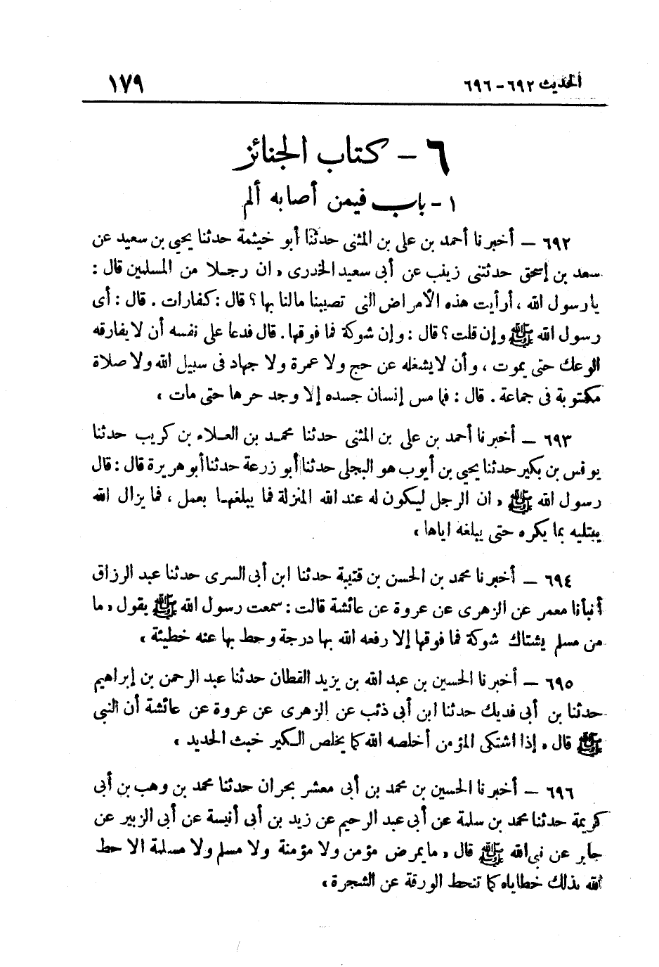 692- أَخْبَرَنَا أَحْمَدُ بْنُ عَلِيِّ بْنِ الْمُثَنَّى حَدَّثَنَا أَبُو خَيْثَمَةَ حَدَّثَنَا يَحْيَى بْنُ سَعِيدٍ عَنْ سَعْدِ بْنِ إِسْحَاق حَدَّثَتْنِي زَيْنَبُ عَنْ أَبِي سَعِيدٍ الْخُدْرِيِّ أَنَّ رَجُلا مِنَ الْمُسْلِمِينَ قَالَ يَا رَسُولَ اللَّهِ أَرَأَيْت هَذِه الْأَمْرَاض الَّتِي تصيبنا مَا لنا بهَا قَالَ: "كَفَّارَات" قَالَ أَيْ رَسُولَ اللَّهِ صَلَّى اللهُ عَلَيْهِ وَسَلَّمَ وَإِنْ قَلَّتْ قَالَ: "وَإِنْ شَوْكَةً فَمَا فَوْقَهَا" قَالَ فَدَعَا عَلَى نَفْسِهِ أَنْ لَا يُفَارِقَهُ الْوَعْكُ حَتَّى يَمُوتَ وَأَنْ لَا يَشْغَلَهُ عَنْ حج وَلَا عُمْرَةٍ وَلا جِهَادٍ فِي سَبِيلِ اللَّهِ وَلا صَلاةٍ مَكْتُوبَةٍ فِي جَمَاعَةٍ قَالَ فَمَا مَسَّ إِنْسَانٌ جَسَدَهُ إِلا وَجَدَ حَرَّهَا حَتَّى مَاتَ.