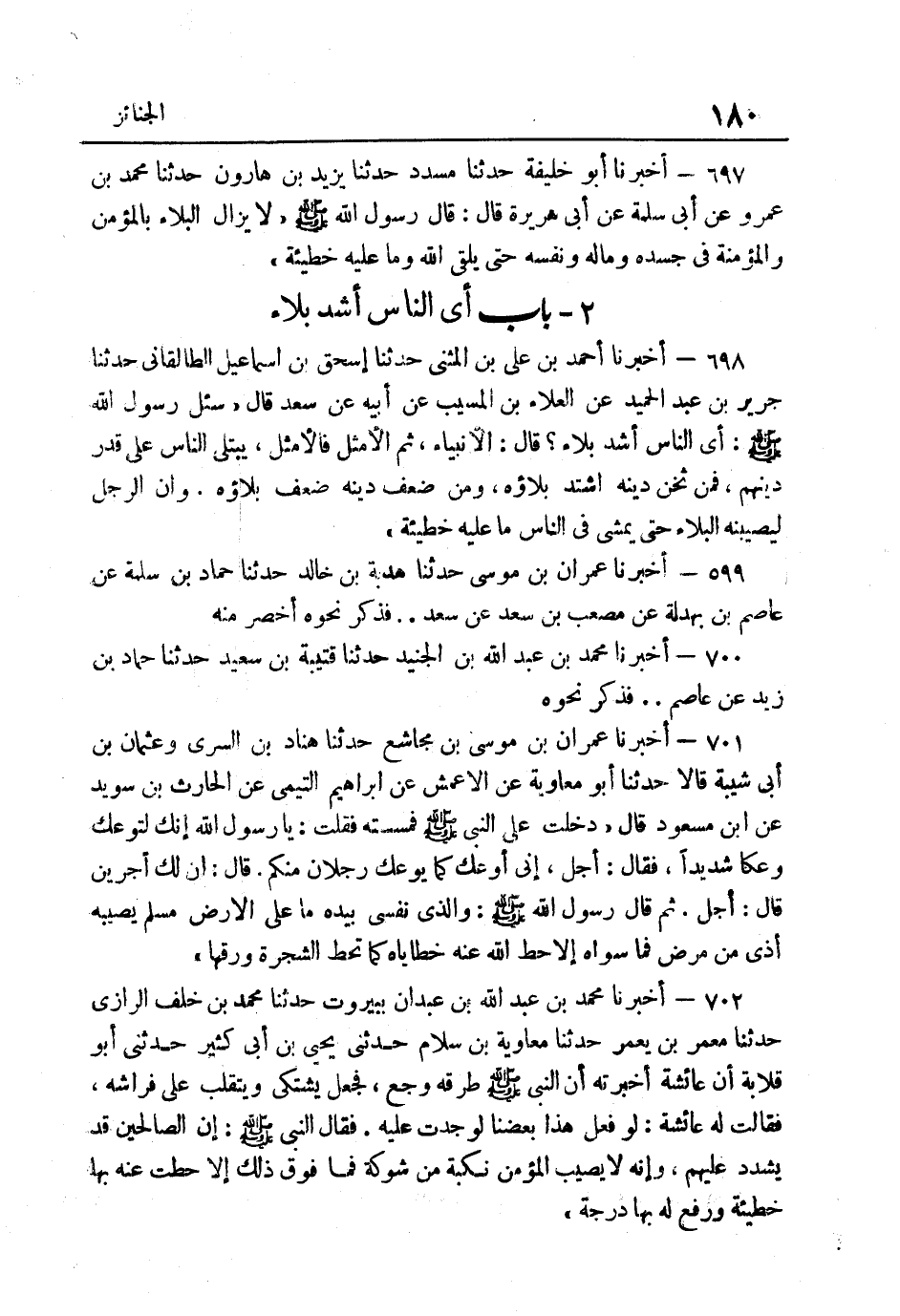 698- أَخْبَرَنَا أَحْمَدُ بْنُ عَلِيِّ بْنِ الْمُثَنَّى حَدَّثَنَا إِسْحَاق بن إِسْمَاعِيل الطَّالقَانِي حَدَّثَنَا جَرِيرُ بْنُ عَبْدِ الْحَمِيدِ عَنِ الْعَلاءِ بْنِ الْمُسَيَّبِ عَنْ أَبِيهِ عَنْ سَعْدٍ قَالَ سُئِلَ رَسُولُ اللَّهِ صَلَّى اللهُ عَلَيْهِ وَسَلَّمَ أَيُّ النَّاسِ أَشَدُّ بَلاءً قَالَ: "الأَنْبِيَاءُ ثُمَّ الأَمْثَلُ فَالأَمْثَلُ يُبْتَلَى النَّاسُ عَلَى قَدْرِ دِينِهِمْ فَمَنْ ثَخُنَ دِينُهُ اشْتَدَّ بَلاؤُهُ وَمَنْ ضَعُفَ دينه ضعف بلاؤه وَإِن الرجل ليصيبنه الْبَلاءُ حَتَّى يَمْشِيَ فِي النَّاسِ مَا عَلَيْهِ خَطِيئَة".