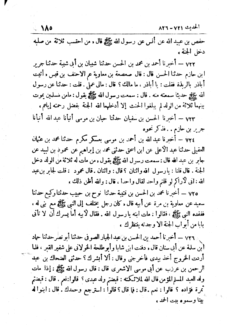 726- أَخْبَرَنَا أَحْمَدُ بْنُ الْحَسَنِ بْنِ عَبْدِ الْجَبَّارِ الصُّوفِي حَدثنَا أَبُو نصر حَدَّثَنَا حَمَّادُ بْنُ سَلَمَةَ عَنْ أَبِي سِنَانٍ قَالَ دفنت ابْني شَابًّا وَأَبُو طَلْحَةَ الْخَوْلانِيُّ عَلَى شَفِيرِ الْقَبْرِ فَلَمَّا أَرَدْتُ الْخُرُوجَ أَخَذَ بِيَدِي فَأَخْرَجَنِي وَقَالَ أَلا أُبَشِّرُكَ حَدَّثَنِي الضَّحَّاكُ بْنُ عَبْدِ الرَّحْمَنِ بْنِ عَرْزَبٍ عَنْ أَبِي مُوسَى الأَشْعَرِيِّ قَالَ قَالَ رَسُولُ اللَّهِ صَلَّى اللهُ عَلَيْهِ وَسَلَّمَ: "إِذَا مَاتَ ولد العَبْد الْمُسلم الْمُؤمن قَالَ الله لملائكته قَبَضْتُمْ وَلَدَ عَبْدِي قَالُوا نَعَمْ قَالَ قَبَضْتُمْ ثَمَرَةَ فُؤَادِهِ قَالُوا نَعَمْ قَالَ فَمَا قَالَ قَالُوا اسْتَرْجَعَ وَحَمِدَكَ قَالَ أَبَنُوا لَهُ بَيْتًا وسموه بَيت الْحَمد".