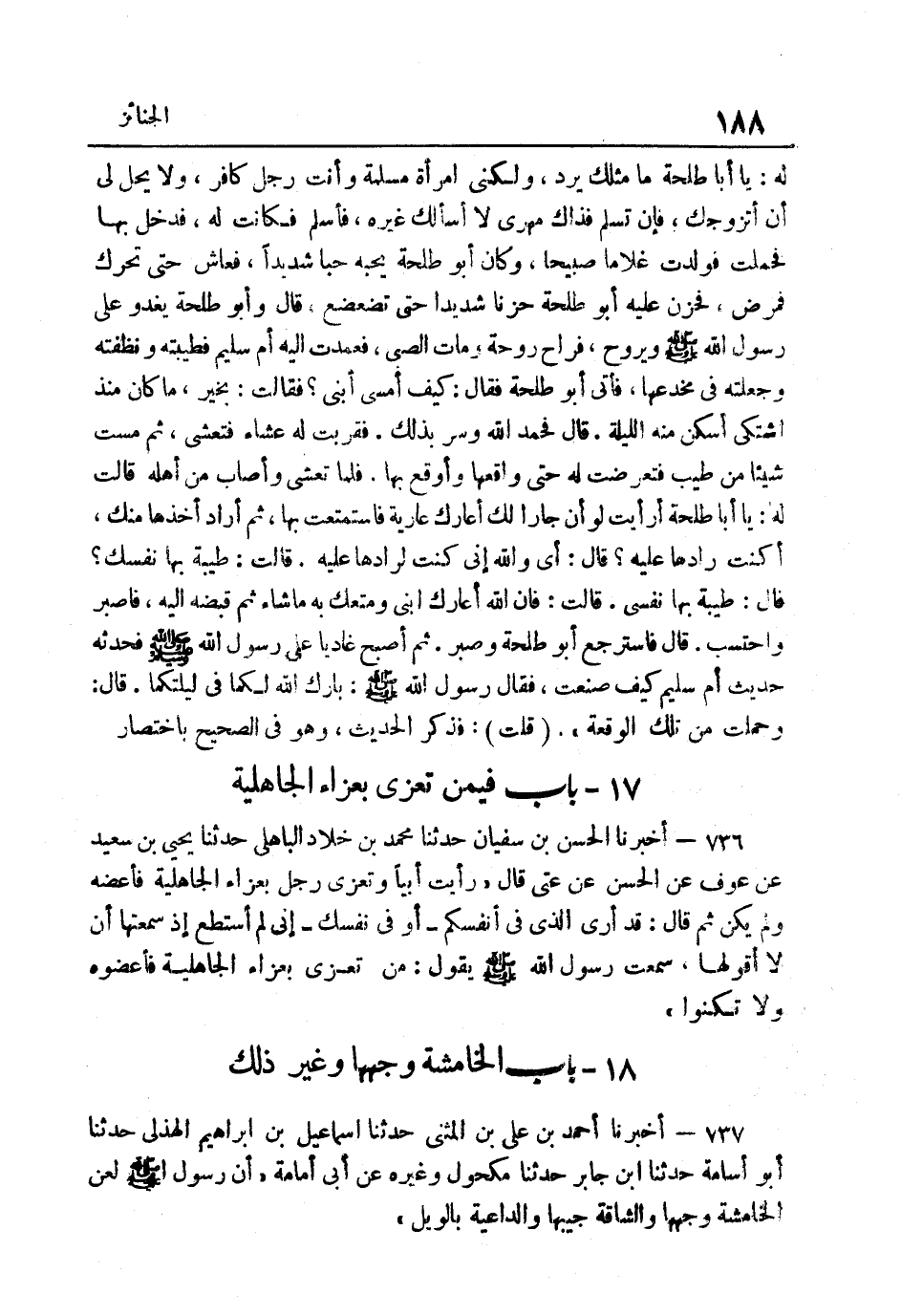لَهُ يَا أَبَا طَلْحَة مَا مثلك يُرَدُّ وَلَكِنِّي امْرَأَةٌ مَسْلِمَةٌ وَأَنْتَ رَجُلٌ كَافِرٌ وَلا يَحِلّ لِي أَنْ أَتَزَوَّجَكَ فَإِنْ تُسْلِمْ فَذَاك مَهْرِي لَا أَسْأَلُكَ غَيْرَهُ فَأَسْلَمَ فَكَانَتْ لَهُ فَدَخَلَ بِهَا فَحَمَلَتْ فَوَلَدَتْ غُلامًا صَبِيحًا وَكَانَ أَبُو طَلْحَةَ يُحِبُّهُ حُبًّا شَدِيدًا فَعَاشَ حَتَّى تَحَرَّكَ فَمَرِضَ فَحَزِنَ عَلَيْهِ أَبُو طَلْحَةَ حُزْنًا شَدِيدًا حَتَّى تَضَعْضَعَ قَالَ وَأَبُو طَلْحَةَ يَغْدُو على رَسُول الله صَلَّى اللهُ عَلَيْهِ وَسَلَّمَ وَيَرُوحُ فَرَاحَ رَوْحَةً وَمَاتَ الصَّبِيُّ فَعَمَدَتْ إِلَيْهِ أم سليم فطيبته ونظفته وَجَعَلته فِي مخدعها فَأتى أَبُو طَلْحَة فَقَالَ كَيفَ أَمْسَى ابْني فَقَالَت بِخَيْرٍ مَا كَانَ مُنْذُ اشْتَكَى أَسْكَنَ مِنْهُ اللَّيْلَةَ قَالَ فَحَمِدَ اللَّهَ وَسُرَّ بِذَلِكَ فَقَرَّبَتْ لَهُ عشَاء فَتَعَشَّى ثُمَّ مَسَّتْ شَيْئًا مِنْ طِيبٍ فَتَعَرَّضَتْ لَهُ حَتَّى وَاقعهَا وأوقع بِهَا فَلَمَّا تَعَشَّى وَأَصَابَ مِنْ أَهْلِهِ قَالَتْ لَهُ يَا أَبَا طَلْحَةَ أَرَأَيْتَ لَوَ أَنَّ جَارًا لَكَ أَعَارَكَ عَارِيَّةً فَاسْتَمْتَعْتَ بِهَا ثُمَّ أَرَادَ أَخذهَا مِنْك أَكنت رادها عَلَيْهِ قَالَ أَي وَالله إِنِّي كنت لرادها عَلَيْهِ قَالَ طَيْبَةً بِهَا نَفْسُكَ قَالَ طَيْبَةً بِهَا نَفْسِي قَالَت فَإِن الله أعارك ابْني ومتعك بِهِ مَا شَاءَ ثمَّ قَبضه إِلَيْهِ فَاصْبِرْ وَاحْتَسَبَ قَالَ فَاسْتَرْجَعَ أَبُو طَلْحَةَ وَصَبَرَ ثُمَّ أَصْبَحَ غَادِيًا عَلَى رَسُولِ اللَّهِ صَلَّى اللهُ عَلَيْهِ وَسَلَّمَ فَحَدَّثَهُ حَدِيثَ أُمِّ سُلَيْمٍ كَيْفَ صَنَعَتْ فَقَالَ رَسُولُ اللَّهِ صَلَّى اللهُ عَلَيْهِ وَسَلَّمَ: "بَارَكَ اللَّهُ لَكُمَا فِي ليلتكما" قَالَ وحملت من تِلْكَ الْوَقْعَة قلت فَذكر الحَدِيث وَهُوَ فِي الصَّحِيح بِاخْتِصَار.