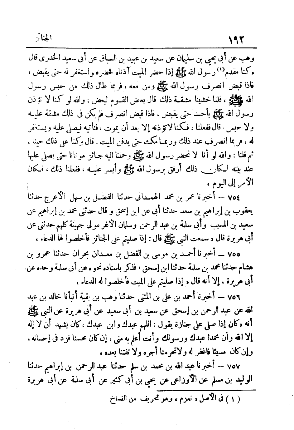 754- أخبرنَا عمر بن مُحَمَّد الْهَمدَانِي حَدثنَا الْفضل بن سهل الْأَعْرَج حَدَّثَنَا يَعْقُوبُ بْنُ إِبْرَاهِيمَ بْنِ سَعْدٍ حَدَّثَنَا أبي عَن ابْن إِسْحَاق وَقَالَ حَدَّثَنِي مُحَمَّدُ بْنُ إِبْرَاهِيمَ عَنْ سَعِيدِ بْنِ الْمُسَيِّبِ وَأَبِي سَلَمَةَ بْنِ عَبْدِ الرَّحْمَنِ وَسَلْمَانَ الْأَغَر مولى جُهَيْنَة كلهم حَدثنِي عَنْ أَبِي هُرَيْرَةَ قَالَ سَمِعْتُ النَّبِيَّ صَلَّى اللهُ عَلَيْهِ وَسَلَّمَ قَالَ: "إِذَا صَلَّيْتُمْ عَلَى الْجَنَائِز فأخلصوا لَهَا الدُّعَاءَ".