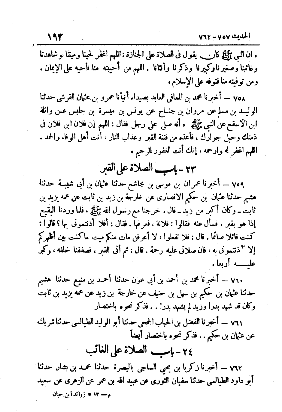 759- أَخْبَرَنَا عِمْرَانُ بْنُ مُوسَى بْنِ مُجَاشِعٍ حَدَّثَنَا عُثْمَان بن أبي شيبَة حَدثنَا هشيم حَدَّثَنَا عُثْمَانُ بْنُ حَكِيمٍ الأَنْصَارِيُّ عَنْ خَارِجَةَ بْنِ زَيْدِ بْنِ ثَابِتٍ عَنْ عَمِّهِ يَزِيدَ بْنِ ثَابِتٍ وَكَانَ أَكْبَرَ مِنْ زَيْدٍ قَالَ خَرَجْنَا مَعَ رَسُولِ اللَّهِ صَلَّى اللهُ عَلَيْهِ وَسَلَّمَ فَلَمَّا وَرَدْنَا الْبَقِيعَ إِذَا هُوَ بِقَبْرٍ فَسَأَلَ عَنهُ فَقَالُوا فُلَانَة فعرفها فَقَالَ: "أَفلا آذَنْتُمُونِي بِهَا" قَالُوا كُنْتُ قَائِلا صَائِمًا قَالَ: "فَلَا تَفعلُوا لَا أَعرفن مَاتَ مِنْكُمْ مَيِّتٌ مَا كُنْتُ بَيْنَ أَظْهُرِكُمْ إِلَّا آذنتموني بِهِ فَإِنِّي صَلاتِي عَلَيْهِ رَحْمَةٌ" قَالَ ثُمَّ أَتَى الْقَبْرَ فصففنا خَلفه وَكبر عَلَيْهِ أَرْبعا.