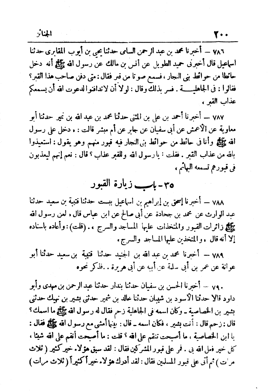 786- أَخْبَرَنَا مُحَمَّدُ بْنُ عَبْدِ الرَّحْمَنِ السَّامِيُّ حَدَّثَنَا يحيى بن أَيُّوب المقابري حَدثنَا إِسْمَاعِيل قَالَ أَخْبَرَنِي حُمَيْدٌ الطَّوِيلُ عَنْ أَنَسِ بْنِ مَالِكٍ عَنْ رَسُولِ اللَّهِ صَلَّى اللهُ عَلَيْهِ وَسَلَّمَ أَنَّهُ دَخَلَ حَائِطًا مِنْ حَوَائِطِ بَنِي النجار فَسمع صَوتا من قبر فَقَالَ: "مَتَى دُفِنَ صَاحِبُ هَذَا الْقَبْرِ" فَقَالُوا فِي الْجَاهِلِيَّةِ فَسُرَّ بِذَلِكَ وَقَالَ: "لَوْلا أَنْ لَا تَدَافَنُوا لَدَعَوْتُ اللَّهَ أَنْ يُسْمِعَكُمْ عَذَابَ الْقَبْرِ".