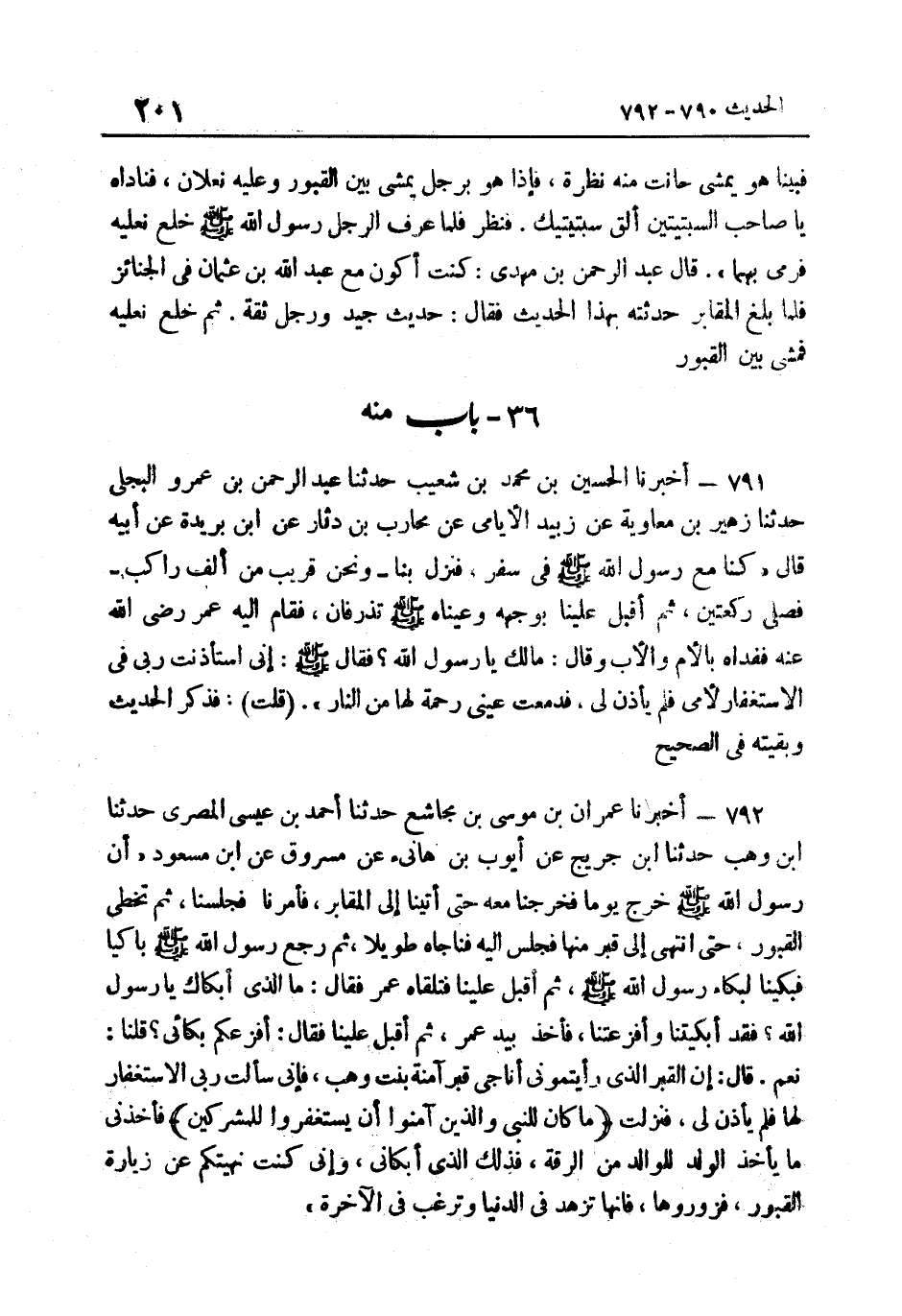 791- أخبرنَا الْحُسَيْن بن مُحَمَّد بن شُعَيْب حَدَّثَنَا عَبْدُ الرَّحْمَنِ بْنُ عَمْرٍو الْبَجَلِيُّ حَدَّثَنَا زُهَيْرُ بْنُ مُعَاوِيَةَ عَنْ زُبَيْدٍ الإِيَامِيِّ عَنْ مُحَارِبِ بْنِ دِثَارٍ عَنِ ابْنِ بُرَيْدَةَ عَنْ أَبِيهِ قَالَ كُنَّا مَعَ رَسُولِ اللَّهِ صَلَّى اللهُ عَلَيْهِ وَسَلَّمَ فِي سَفَرٍ فَنَزَلَ بِنَا وَنحن قريب من ألف رَاكب فصلى رَكْعَتَيْنِ ثمَّ أقبل علينا بِوَجْهِهِ وَعَيناهُ صَلَّى اللهُ عَلَيْهِ وَسَلَّمَ تَذْرِفَانِ فَقَامَ إِلَيْهِ عمر رَضِي الله عَنهُ فَفَدَاهُ بِالْأُمِّ وَالْأَب وَقَالَ مَا لَكَ يَا رَسُولَ اللَّهِ فَقَالَ صَلَّى اللهُ عَلَيْهِ وَسَلَّمَ: "إِنِّي اسْتَأْذَنت رَبِّي فِي الاسْتِغْفَارِ لأُمِّي فَلَمْ يَأْذَنْ لِي فَدَمَعَتْ عَيْني رَحْمَة لَهَا من النَّار" قلت فَذكر الحَدِيث وبقيته فِي الصَّحِيح.