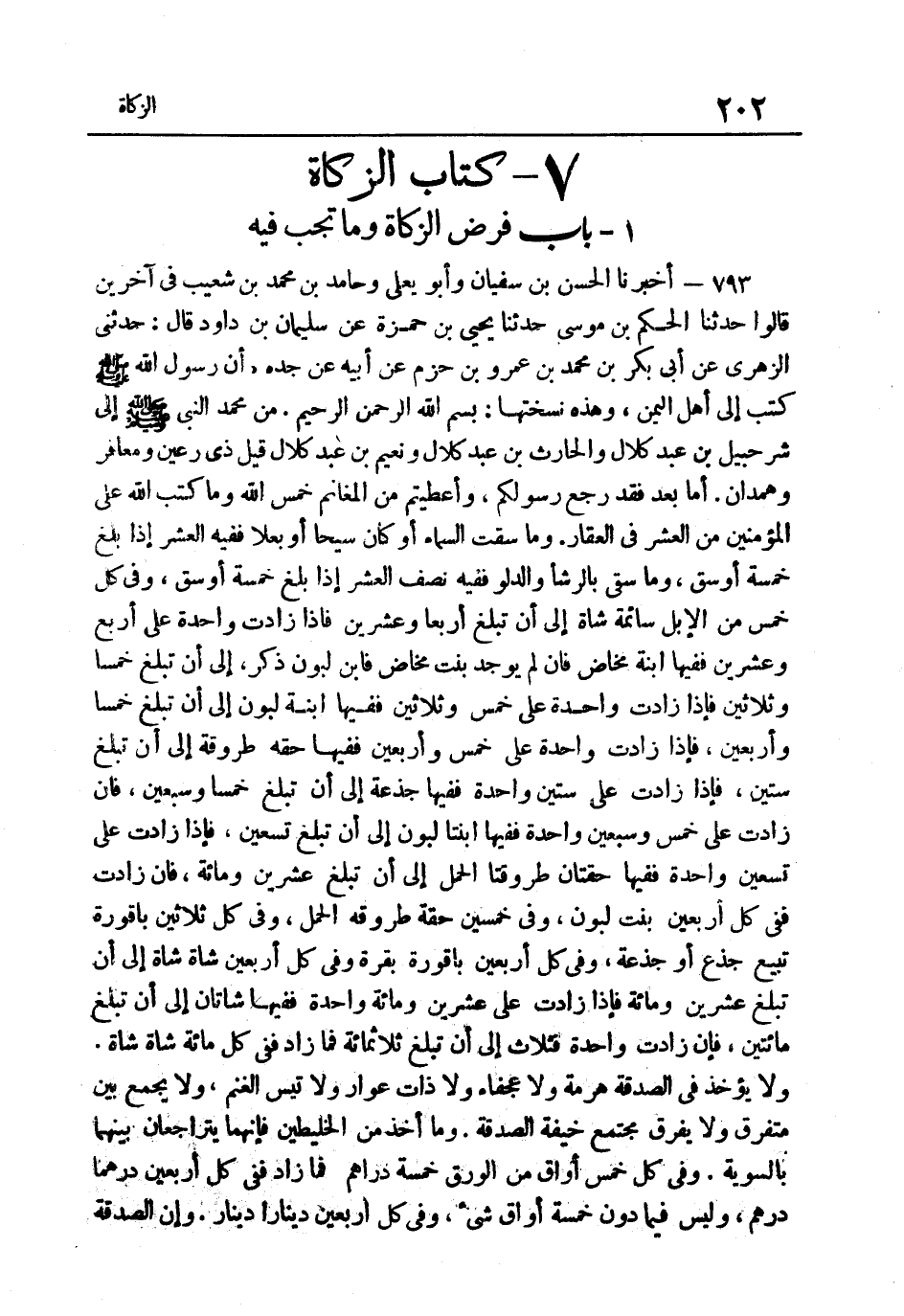 793- أَخْبَرَنَا الْحَسَنُ بْنُ سُفْيَانَ وَأَبُو يَعْلَى وَحَامِدُ بْنُ مُحَمَّدِ بْنِ شُعَيْبٍ فِي آخَرِينَ قَالُوا حَدَّثَنَا الْحَكَمُ بْنُ مُوسَى حَدَّثَنَا يَحْيَى بْنُ حَمْزَة عَن سُلَيْمَان بن دَاوُد قَالَ حَدَّثَنِي الزُّهْرِيُّ عَنْ أَبِي بَكْرِ بْنِ مُحَمَّدِ بْنِ عَمْرِو بْنِ حَزْمٍ عَنْ أَبِيهِ عَنْ جَدِّهِ أَنّ رَسُولَ اللَّهِ صَلَّى اللهُ عَلَيْهِ وَسَلَّمَ كتب إِلَى أهل الْيمن وَهَذِه: "نسختها بِسم الله الرَّحْمَن الرَّحِيم مِنْ مُحَمَّدٍ النَّبِيِّ صَلَّى اللهُ عَلَيْهِ وَسَلَّمَ إِِلَى شُرَحْبِيلَ بْنِ عَبْدِ كُلالٍ وَالْحَارِثِ بْنِ عَبْدِ كُلالٍ وَنُعَيْمِ بْنِ عَبْدِ كُلالٍ قِيلَ ذِي رُعَيْنٍ وَمَعَافِرَ وَهَمْدَانَ أَمَّا بَعْدُ فَقَدْ رَجَعَ رَسُولكُم وأعطيتم من الْمَغَانِم خُمُسَ اللَّهِ وَمَا كَتَبَ اللَّهُ عَلَى الْمُؤْمِنِينَ مِنَ الْعُشْرِ فِي الْعَقَارِ وَمَا سَقَتِ السَّمَاءُ أَوْ كَانَ سَيْحًا أَوْ بَعْلا فَفِيهِ الْعُشْرُ إِذا بلغ خَمْسَة أوسق وَمَا سقى بالرشأ والدلو فَفِيهِ نِصْفُ الْعُشْرِ إِِذَا بَلَغَ خَمْسَةَ أَوْسُقٍ وَفِي كُلِّ خَمْسٍ مِنَ الإِِبِلِ سَائِمَةً شَاةٌ إِِلَى أَنْ تَبْلُغَ أَرْبَعًا وَعِشْرِينَ فَإِِذَا زَادَتْ وَاحِدَةٌ عَلَى أَرْبَعٍ وَعِشْرِينَ فَفِيهَا ابْنَةُ مَخَاضٍ فَإِن لم يُوجد بِنْتُ مَخَاضٍ فَابْنُ لَبُونٍ ذَكَرٍ إِِلَى أَنْ تبلغ خمْسا وَثَلَاثِينَ فَإِذا زَادَت وَاحِدَة عَلَى خَمْسٍ وَثَلاثِينَ فَفِيهَا ابْنَةُ لَبُونٍ إِِلَى أَن تبلغ خمْسا وَأَرْبَعين فَإِذا زَادَت وَاحِدَة عَلَى خَمْسٍ وَأَرْبَعِينَ فَفِيهَا حِقَّةٌ طَرُوقَةٌ إِِلَى أَن تبلغ سِتِّينَ فَإِذا زَادَتْ عَلَى سِتِّينَ وَاحِدَةً فَفِيهَا جَذَعَةٌ إِِلَى أَن تبلغ خمْسا وَسَبْعِينَ فَإِِنْ زَادَتْ عَلَى خَمْسٍ وَسَبْعِينَ وَاحِدَةً فَفِيهَا ابْنَتَا لَبُونٍ إِِلَى أَنْ تَبْلُغَ تِسْعِينَ فَإِذا زَاد ت على تسعين وَاحِدَة فَفِيهَا حقتان طروقتا الْحمل إِِلَى أَنْ تَبْلُغَ عِشْرِينَ وَمِائَةً فَإِِنْ زَادَتْ فَفِي كل أَرْبَعِينَ بنت لبون وَفِي خمسين حقة طروقة الْحمل وَفِي كل ثَلَاثِينَ باقورة تبيع جذع أَو جَذَعَة وَفِي كُلِّ أََرْبَعِينَ بَاقُورَةُ بَقَرَةٍ وَفِي كُلِّ أَرْبَعِينَ شَاة شَاة إِلَى أَن تبلغ عشْرين وَمِائَة فَإِذا زَادَتْ عَلَى عِشْرِينَ وَمِائَةً وَاحِدَةً فَفِيهَا شَاتَانِ إِلَى أَن تبلغ مِائَتَيْنِ فَإِن زَادَت وَاحِدَة فَثَلَاث إِلَى أَن تبلغ ثَلَاثمِائَة فَمَا زَادَ فَفِي كُلِّ مِائَةِ شَاةٍ شَاةٌ وَلَا يُؤْخَذ فِي الصَّدَقَةِ هَرِمَةٌ وَلا عَجْفَاءُ وَلا ذَاتُ عَوَارٍ وَلا تَيْسُ الْغَنَمِ وَلا يُجْمَعُ بَيْنَ متفرق وَلَا يفرق مُجْتَمِعٍ خِيفَةَ الصَّدَقَةَ وَمَا أُخِذَ مِنَ الْخَلِيطَيْنِ فَإِِنَّهُمَا يَتَرَاجَعَانِ بَيْنَهُمَا بِالسَّوِيَّةِ وَفِي كُلِّ خَمْسِ أَوَاقٍ من الْوَرق خَمْسَة دَرَاهِم فَمَا زاذ فَفِي كُلِّ أَرْبَعِينَ دِرْهَمًا دِرْهَمٌ وَلَيْسَ فِيمَا دون خَمْسَة أَوَاقٍ شَيْءٌ وَفِي كُلِّ أَرْبَعِينَ دِينَارًا دِينَارٌ وَإِن الصَّدَقَة