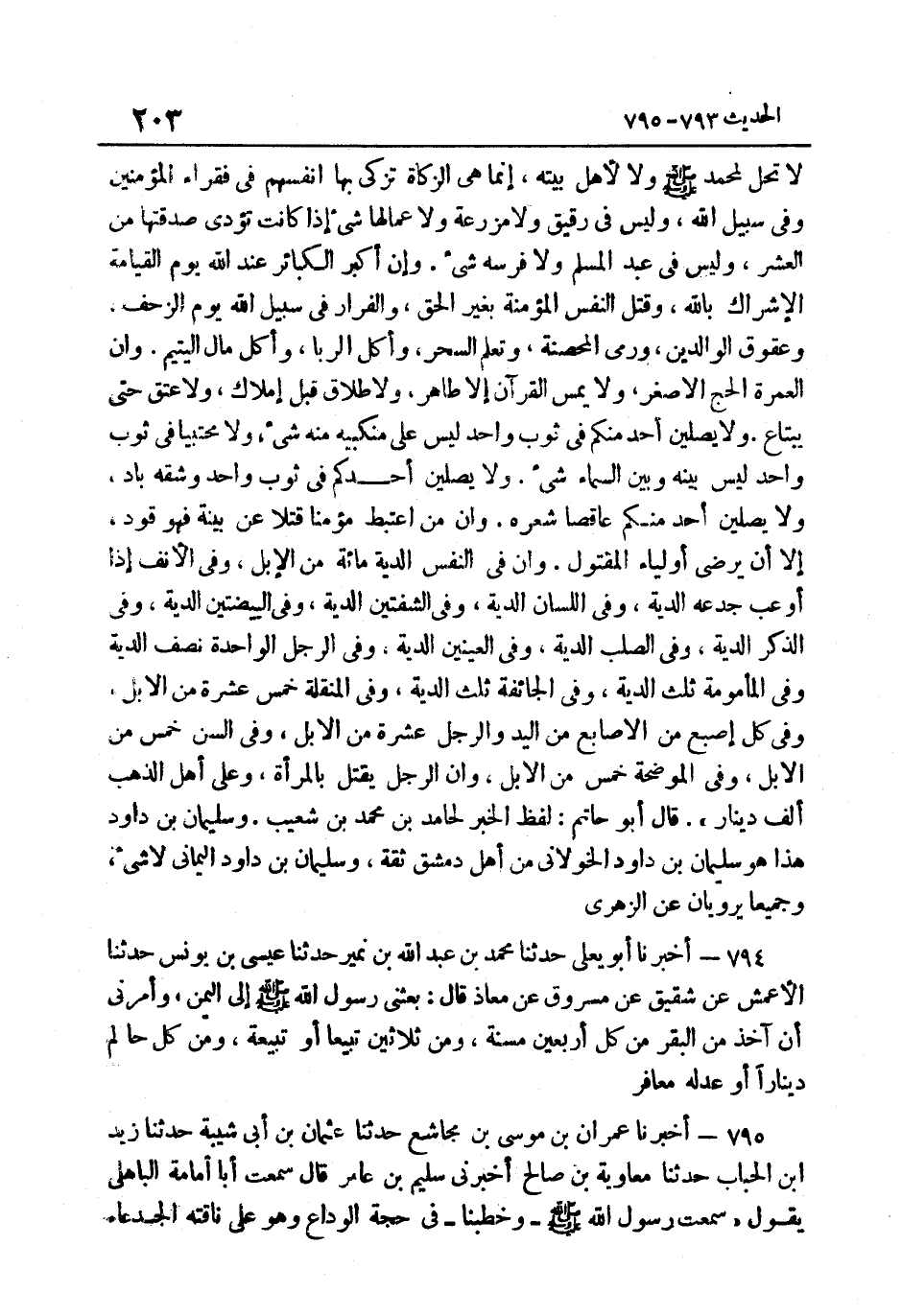 لَا تحل لمُحَمد صَلَّى اللهُ عَلَيْهِ وَسَلَّمَ وَلَا لأهل بَيته إِنَّمَا هِيَ الزَّكَاةُ تُزَكَّى بِهَا أَنْفُسُهُمْ فِي فُقَرَاءِ الْمُؤمنِينَ وَفِي سَبِيلِ اللَّهِ وَلَيْسَ فِي رَقِيقٍ وَلا مَزْرَعَةٍ وَلا عُمَّالِهَا شَيْءٌ إِِذَا كَانَتْ تُؤَدَّى صَدَقُتُهَا مِنَ الْعُشْرِ وَلَيْسَ فِي عَبْدِ الْمُسْلِمِ وَلا فَرَسِهِ شَيْءٌ وَإِِنَّ أَكْبَرَ الْكَبَائِرِ عِنْدَ اللَّهِ يَوْمَ الْقِيَامَةِ الإِِشْرَاكُ بِاللَّهِ وَقَتْلُ النَّفْسِ الْمُؤْمِنَةِ بِغَيْرِ الْحَقِّ وَالْفِرَارُ فِي سَبِيلِ اللَّهِ يَوْمَ الزَّحْفِ وَعُقُوقُ الْوَالِدَيْنِ وَرَمْيُ الْمُحْصَنَةِ وَتَعَلُّمُ السَّحَرِ وَأَكَلُ الرِّبَا وَأَكْلُ مَالِ الْيَتِيمِ وَإِِنَّ الْعُمْرَةَ الْحَجُّ الأَصْغَرِ وَلا يَمَسُّ الْقُرْآنَ إِِلا طَاهِرٌ وَلا طَلاقَ قَبْلَ إِِمْلاكٍ وَلا عِتْقَ حَتَّى يبْتَاع وَلَا يصلين أحد مِنْكُم فِي ثوب وَاحِد لَيْسَ على مَنْكِبَيْه مِنْهُ شَيْء وَلَا مُحْتَبِيًا فِي ثَوْبٍ وَاحِدٍ لَيْسَ بَيْنَهُ وَبَيْنَ السَّمَاءِ شَيْءٌ وَلا يُصَلِّيَنَّ أَحَدُكُمْ فِي ثَوْبٍ وَاحِدٍ وَشقه باد وَلَا يصلين أحد مِنْكُم عَاقِصًا شَعْرَهُ وَإِِنَّ مَنِ اعْتَبَطَ مُؤْمِنًا قَتْلا عَنْ بَيِّنَةٍ فَهُوَ قَوَدٌ إِِلا أَنْ يَرْضَى أَوْلِيَاءُ الْمَقْتُولِ وَإِِنَّ فِي النَّفْسِ الدِّيَةَ مِائَةٌ مِنَ الإِِبِلِ وَفِي الأَنْفِ إِِذَا أُوعِبَ جَدْعُهُ الدِّيَةُ وَفِي اللِّسَانِ الدِّيَةُ وَفِي الشَّفَتَيْنِ الدِّيَةُ وَفِي الْبَيْضَتَيْنِ الدِّيَةُ وَفِي الذَّكَرِ الدِّيَةُ وَفِي الصُّلْبِ الدِّيَةُ وَفِي الْعَيْنَيْنِ الدِّيَةُ وَفِي الرِّجْلِ الْوَاحِدَةِ نِصْفُ الدِّيَةِ وَفِي الْمَأْمُومَةِ ثُلُثُ الدِّيَةِ وَفِي الْجَائِفَةِ ثُلُثُ الدِّيَةِ وَفِي الْمُنَقِّلَةِ خَمْسَ عَشْرَةَ مِنَ الإِِبِلِ وَفِي كُلِّ أُصْبُعٍ مِنَ الْأَصَابِع من الْيَد وَالرجل عشرَة مِنَ الإِِبِلِ وَفِي السِّنِّ خَمْسٌ مِنَ الإِِبِلِ وَفِي الْمُوضِحَةِ خَمْسٌ مِنَ الإِِبِلِ وَإِِنَّ الرَّجُلَ يُقْتَلُ بِالْمَرْأَةِ وَعَلَى أَهْلِ الذَّهَبِ أَلْفُ دِينَارٍ". قَالَ أَبُو حَاتِم لَفْظُ الْخَبَرِ لِحَامِدِ بْنِ مُحَمَّدِ بْنِ شُعَيْبٍ وَسليمَان بْنُ دَاوُدَ هَذَا هُوَ سُلَيْمَانُ بْنُ دَاوُدَ الْخَولَانِيّ من أهل دمشق ثِقَة وَسليمَان بن دَاوُد الْيَمَانِيّ لَا شَيْء وجميعا يرويان عَن الزُّهْرِيّ.