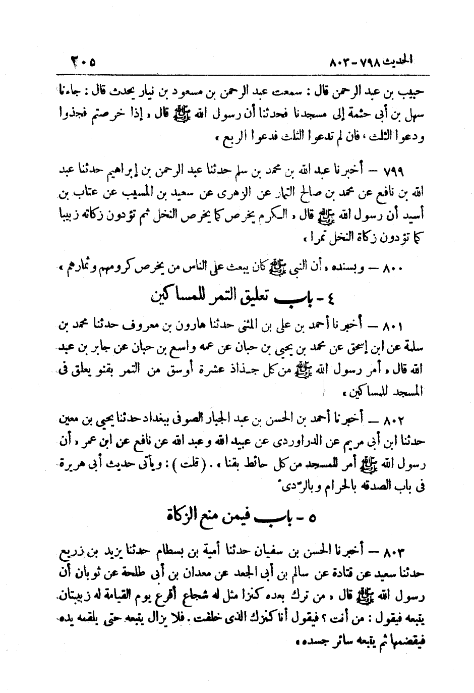799- أَخْبَرَنَا عَبْدُ اللَّهِ بْنُ مُحَمَّدِ بْنِ سَلْمٍ حَدَّثَنَا عَبْدُ الرَّحْمَنِ بْنُ إِبْرَاهِيمَ حَدَّثَنَا عَبْدُ اللَّهِ بْنُ نَافِعٍ عَنْ مُحَمَّدِ بْنِ صَالِحٍ التَّمَّارِ عَنِ الزُّهْرِيِّ عَنْ سَعِيدِ بْنِ الْمُسَيِّبِ عَنْ عَتَّابِ بْنِ أُسَيْدٍ أَنَّ رَسُولَ اللَّهِ صَلَّى اللهُ عَلَيْهِ وَسَلَّمَ قَالَ: "الْكَرْمُ يُخْرَصُ كَمَا يخرص النّخل ثمَّ تؤدون زَكَاته زبيبا كَمَا تؤدون زَكَاة النّخل تَمرا".