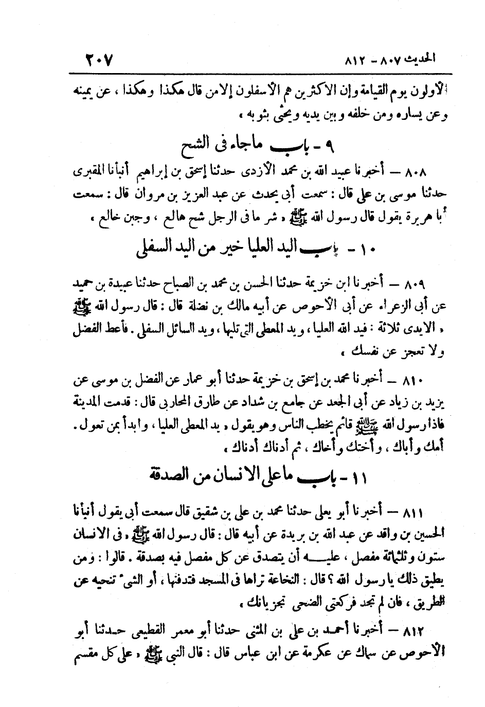 809 أخبرنَا ابْن خُزَيْمَة حَدَّثَنَا الْحَسَنُ بْنُ مُحَمَّدِ بْنِ الصَّبَّاحِ حَدَّثَنَا عُبَيْدَة بن حميد عَن أبي الزَّعْرَاءِ عَنْ أَبِي الأَحُوَصِ عَنْ أَبِيهِ مَالِكِ بْنِ نَضْلَة قَالَ قَالَ رَسُولُ اللَّهِ صَلَّى اللهُ عَلَيْهِ وَسَلَّمَ: "الأَيْدِي ثَلاثَةٌ فَيَدُ اللَّهِ الْعليا وَيَد الْمُعْطِي الَّتِي تَلِيهَا وَيَد السَّائِل السُّفْلى فأعط الْفضل وَلَا تعجز عَن نَفسك".