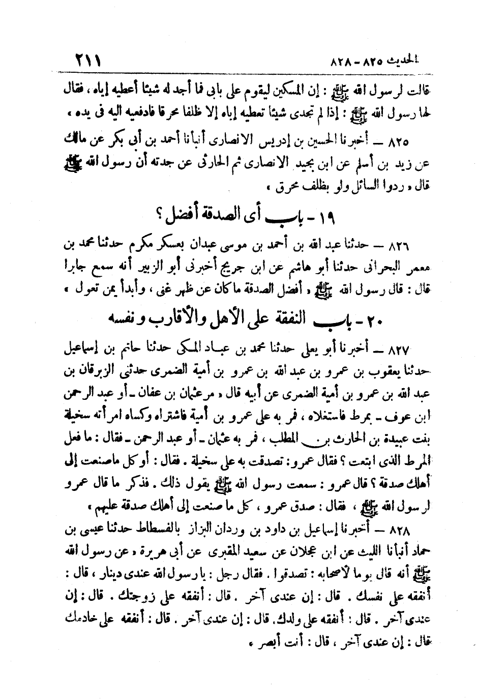 828- أَخْبَرَنَا إِسْمَاعِيلُ بْنُ دَاوُدَ بْنِ وَرْدَانَ الْبَزَّازُ بالفسطاط حَدثنَا عِيسَى بن حَمَّاد أَنبأَنَا اللَّيْثُ عَنِ ابْنِ عَجْلانَ عَنْ سَعِيدٍ الْمَقْبُرِيِّ عَنْ أَبِي هُرَيْرَةَ عَنْ رَسُولِ اللَّهِ صَلَّى اللهُ عَلَيْهِ وَسَلَّمَ أَنَّهُ قَالَ يَوْمًا لأَصْحَابِهِ: "تَصَدَّقُوا" فَقَالَ رَجُلٌ يَا رَسُولَ اللَّهِ عِنْدِي دِينَارٌ قَالَ: "أَنْفِقْهُ عَلَى نَفْسِكَ" قَالَ إِنَّ عِنْدِي آخَرَ قَالَ: "أَنْفِقْهُ عَلَى زَوْجَتِكَ" قَالَ إِنَّ عِنْدِي آخَرَ قَالَ: "أَنْفِقْهُ عَلَى وَلَدِكَ" قَالَ إِنَّ عِنْدِي آخَرَ قَالَ: "أَنْفِقْهُ عَلَى خَادِمِكَ" قَالَ إِنَّ عِنْدِي آخَرَ قَالَ: "أَنْتَ أبْصر".