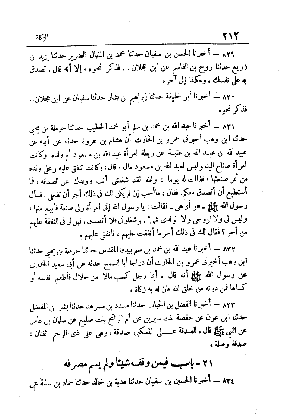 831- أَخْبَرَنَا عَبْدُ اللَّهِ بْنُ مُحَمَّدِ بْنِ سَلْمٍ أَبُو مُحَمَّد الْخَطِيب حَدَّثَنَا حَرْمَلَةُ بْنُ يَحْيَى حَدَّثَنَا ابْنُ وَهْبٍ أَخْبَرَنِي عَمْرُو بْنُ الْحَارِثِ أَنَّ هِشَامَ بْنَ عُرْوَةَ حَدَّثَهُ عَنْ أَبِيهِ عَنْ عُبَيْدِ اللَّهِ بْنِ عَبْدِ اللَّهِ بْنِ عُتْبَةَ عَنْ رَيْطَةَ امْرَأَةِ عَبْدِ اللَّهِ بْنِ مَسْعُودٍ أُمِّ وَلَدِهِ وَكَانَت امْرَأَة صناع الْيَد وَلَيْسَ لعبد الله بن مَسْعُود مَال قَالَ وَكَانَت تنْفق عَلَيْهِ وعَلى وَلَده من ثَمَر صنعتها فَقَالَت لَهُ يَوْمًا وَاللَّهِ لَقَدْ شَغَلْتَنِي أَنْتَ وَوَلَدُكَ عَنِ الصَّدَقَةِ فَمَا أَسْتَطِيع أَن أَتصدق مَعكُمْ قَالَ مَا أُحِبُّ إِِنْ لَمْ يَكُنْ لَكِ فِي ذَلِكَ أَجْرٌ أَنْ تَفْعَلِي فَسَأَلَ رَسُولُ اللَّهِ صَلَّى اللهُ عَلَيْهِ وَسَلَّمَ هُوَ أَو هِيَ فَقَالَتْ يَا رَسُولَ اللَّهِ إِِنِّي امْرَأَةٌ وَلِيَ صَنْعَةٌ فَأَبِيعُ مِنْهَا وَلَيْسَ لِي وَلا لِزَوْجِي وَلا لِوَلَدِي شَيْءٌ وَشَغَلُونِي فَلا أَتَصَدَّقُ فَهَلْ لِي فِي النَّفَقَةِ عَلَيْهِمْ مِنْ أَجْرٍ فَقَالَ: "لَكِ فِي ذَلِكَ أَجْرٌ مَا أَنْفَقْتِ عَلَيْهِمْ فأنفقي عَلَيْهِمْ".