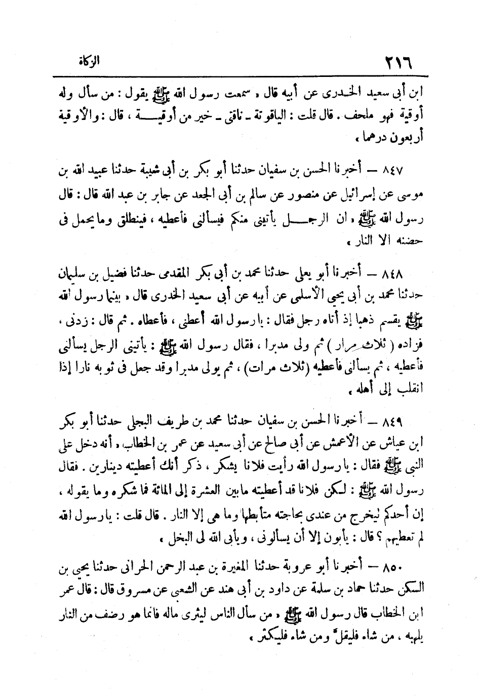 849- أَخْبَرَنَا الْحَسَنُ بْنُ سُفْيَانَ حَدَّثَنَا مُحَمَّدُ بْنُ طريف البَجلِيّ حَدَّثَنَا أَبُو بَكْرِ بْنُ عَيَّاشٍ عَنِ الأَعْمَشِ عَنْ أَبِي صَالِحٍ عَنْ أَبِي سَعِيدٍ عَنِ عُمَرَ بْنِ الْخَطَّابِ أَنَّهُ دَخَلَ عَلَيَّ النَّبِيُّ صَلَّى اللهُ عَلَيْهِ وَسَلَّمَ فَقَالَ يَا رَسُولَ اللَّهِ رَأَيْتُ فُلانًا يَشْكُرُ ذَكَرَ أَنَّكَ أَعْطَيْتَهُ دينارين فَقَالَ رَسُولُ اللَّهِ صَلَّى اللهُ عَلَيْهِ وَسَلَّمَ: "لَكِنَّ فُلانًا قَدْ أَعْطَيْتُهُ مَا بَيْنَ الْعَشَرَةِ إِلَى الْمِائَة فَمَا شكره وَمَا يَقُوله إِن أحدكُم ليخرج من عِنْدِي بحاجته مُتَأَبِّطَهَا وَمَا هِيَ إِلا النَّارُ" قَالَ قُلْتُ يَا رَسُول الله لم تعطيهم قَالَ: "يَأْبَوْنَ إِلا أَنْ يَسْأَلُونِي وَيَأْبَى اللَّهُ لي الْبُخْل".