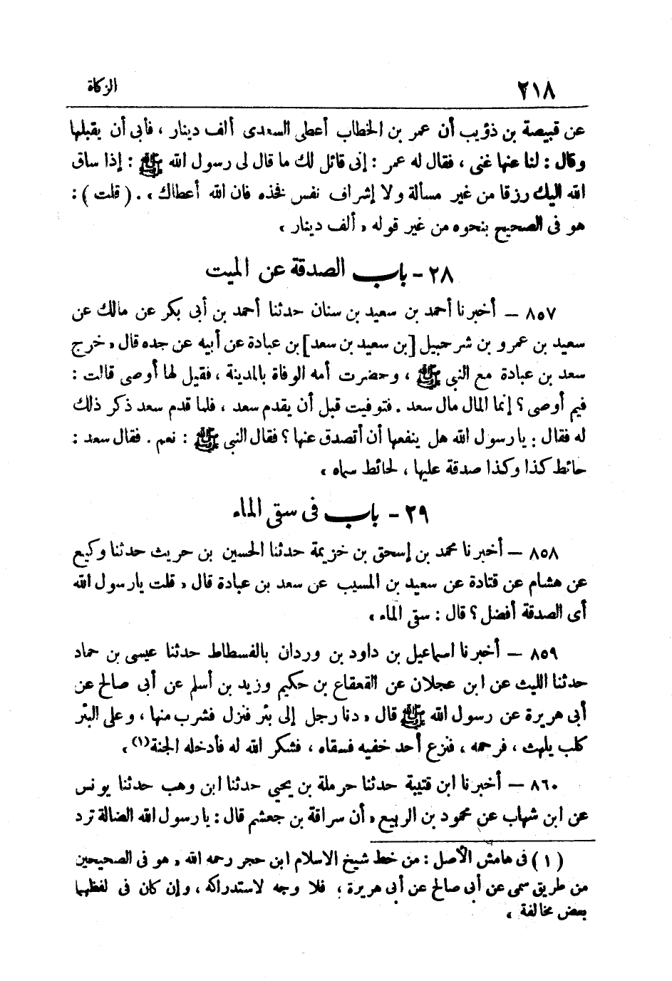 859- أَخْبَرَنَا إِسْمَاعِيلُ بْنُ دَاوُدَ بْنِ وَرْدَانَ بِالْفُسْطَاطِ حَدَّثَنَا عِيسَى بْنُ حَمَّادٍ حَدَّثَنَا اللَّيْثُ عَنِ ابْنِ عَجْلانَ عَنِ الْقَعْقَاعِ بْنِ حَكِيمٍ وَزَيْدِ بْنِ أَسْلَمَ عَنْ أَبِي صَالِحٍ عَنْ أَبِي هُرَيْرَةَ عَنْ رَسُولِ اللَّهِ صَلَّى اللهُ عَلَيْهِ وَسَلَّمَ قَالَ: "دَنَا رَجُلٌ إِلَى بِئْرٍ فَنَزَلَ فَشَرِبَ مِنْهَا وَعَلَى الْبِئْرِ كلب يَلْهَث فرحمه فَنزع أحد خفيه فَسَقَاهُ فَشكر الله لَهُ فَأدْخلهُ الْجنَّة" 1.