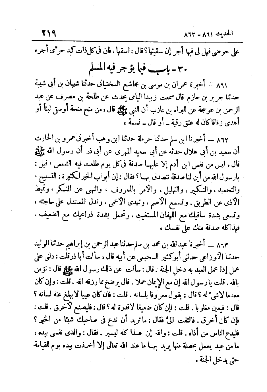 862- أَخْبَرَنَا ابْنُ سَلْمٍ حَدَّثَنَا حَرْمَلَةُ حَدَّثَنَا ابْنُ وَهْبٍ أَخْبَرَنِي عَمْرُو بْنُ الْحَارِثِ أَنَّ سَعِيدَ بْنَ أَبِي هِلالٍ حَدَّثَهُ عَنْ أَبِي سَعِيدٍ الْمهرِي عَن أبي ذَر أَن رَسُول الله صَلَّى اللهُ عَلَيْهِ وَسَلَّمَ قَالَ: "لَيْسَ مِنْ نَفْسِ ابْنِ آدَمَ إِلا عَلَيْهَا صَدَقَةٌ فِي كُلِّ يَوْمٍ طَلَعَتْ فِيهِ الشَّمْسُ" قِيلَ يَا رَسُول الله من أَيْنَ لَنَا صَدَقَةٌ نَتَصَدَّقُ بِهَا فَقَالَ: "إِنَّ أَبُوَابَ الْخَيْرِ لَكَثِيرَةٌ التَّسْبِيحُ وَالتَّحْمِيدُ وَالتَّكْبِيرُ وَالتَّهْلِيلُ وَالأَمْرُ بِالْمَعْرُوفِ وَالنَّهِيُ عَنِ الْمُنْكَرِ وَتُمِيطُ الأَذَى عَنِ الطَّرِيقِ وَتُسْمِعُ الأَصَمَّ وَتَهْدِي الأَعْمَى وَتُدِلُّ الْمُسْتَدِلَّ عَلَى حَاجَتِهِ وَتَسْعَى بِشِدَّةِ سَاقَيْكَ مَعَ اللَّهْفَانِ الْمُسْتَغِيثِ وَتَحْمِلُ بِشِدَّةِ ذِرَاعَيْكَ مَعَ الضَّعِيفِ فَهَذَا كُله صَدَقَة مِنْك على نَفسك".