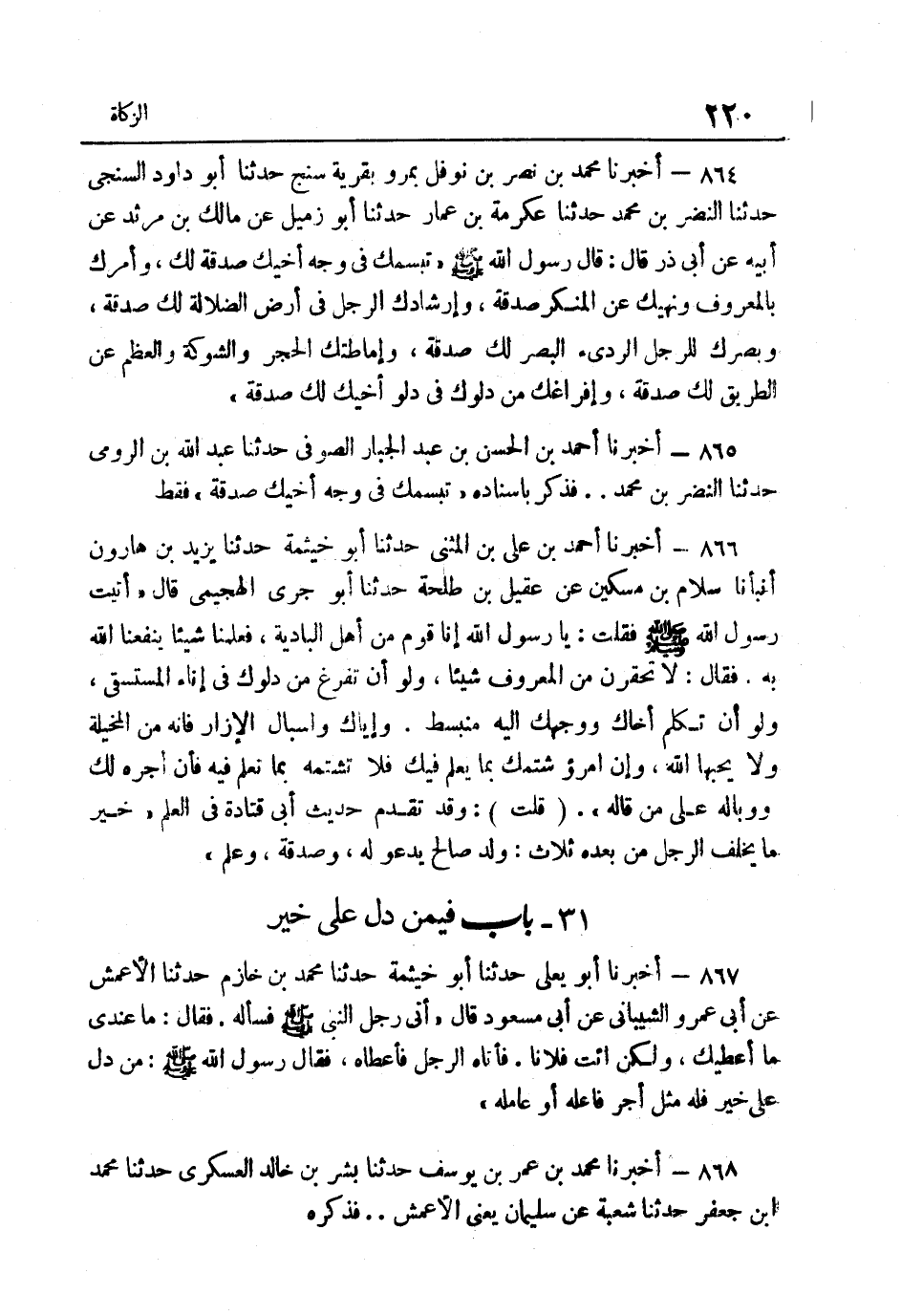 864- أَخْبَرَنَا مُحَمَّدُ بْنُ نَصْرِ بْنِ نَوْفَلٍ بِمَرْوَ بِقَرْيَةِ سِنْجَ حَدَّثَنَا أَبُو دَاوُدَ السِّنْجِيُّ حَدَّثَنَا النَّضْرُ بْنُ مُحَمَّدٍ حَدَّثَنَا عِكْرِمَةُ بْنُ عَمَّارٍ حَدَّثَنَا أَبُو زُمَيْلٍ عَنْ مَالِكِ بْنِ مَرْثَدٍ عَنْ أَبِيهِ عَنْ أَبِي ذَرٍّ قَالَ قَالَ رَسُولُ اللَّهِ صَلَّى اللهُ عَلَيْهِ وَسَلَّمَ: "تَبَسُّمُكَ فِي وَجْهِ أَخِيكَ صَدَقَةٌ لَكَ وَأَمْرُكَ بِالْمَعْرُوفِ وَنَهْيُكَ عَنِ الْمُنْكَرِ صَدَقَةٌ وَإِرْشَادُكَ الرَّجُلَ فِي أَرض الضَّلَالَة لَك صَدَقَة وبصرك للرجل الردئ الْبَصَرِ لَكَ صَدَقَةٌ وَإِمَاطَتُكَ الْحَجَرَ وَالشَّوْكَةَ وَالْعَظْمَ عَنِ الطَّرِيقِ لَكَ صَدَقَةٌ وَإِفْرَاغُكَ مِنْ دَلْوِكَ فِي دلو أَخِيك لَك صَدَقَة".