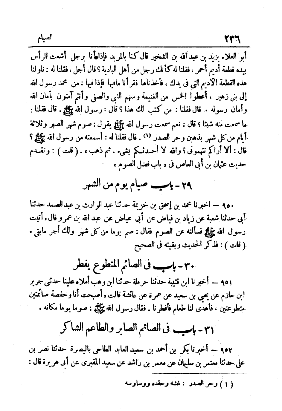 أَبُو الْعَلاءِ يَزِيدُ بْنُ عَبْدِ اللَّهِ بْنِ الشِّخِّيرِ قَالَ كُنَّا بِالْمِرْبَدِ فَإِِذَا أَنَا بِرَجُلٍ أَشْعَث الرَّأْس بِيَدِهِ قِطْعَة أَدِيم أَحْمَر فَقُلْنَا لَهُ كَأَنَّكَ رَجُلٌ مِنْ أَهْلِ الْبَادِيَةِ قَالَ أَجَلْ فَقُلْنَا لَهُ نَاوِلْنَا هَذِهِ الْقِطْعَةَ الأَدِيمِ الَّتِي فِي يَدِكَ فَأَخْذَنَاهَا فَقَرَأْنَا مَا فِيهَا فَإِِذَا فِيهَا مِنْ مُحَمَّدٍ رَسُولِ اللَّهِ إِِلَى بَنِي زُهَيْرٍ أَعْطُوا الْخُمُسَ مِنَ الْغَنِيمَةِ وَسَهْمَ النَّبِيِّ وَالصَّفِيِّ وَأَنْتُمْ آمِنُونَ بِأَمَانِ اللَّهِ وَأَمَانِ رَسُولِهِ قَالَ فَقُلْنَا مَنْ كَتَبَ لَكَ هَذَا قَالَ رَسُولُ اللَّهِ صَلَّى اللهُ عَلَيْهِ وَسَلَّمَ قَالَ فَقُلْنَا مَا سَمِعْتَ مِنْهُ شَيْئًا قَالَ نَعَمْ سَمِعْتُ رَسُولَ اللَّهِ صَلَّى اللهُ عَلَيْهِ وَسَلَّمَ يَقُول: "صَوْمُ شَهْرِ الصَّبْرِ وَثَلاثَةِ أَيَّامٍ مِنْ كُلِّ شهر يذْهبن وحر الصَّدْر1" قَالَ فَقُلْنَا لَهُ أَسَمِعْتَهُ مِنْ رَسُولِ اللَّهِ صَلَّى اللهُ عَلَيْهِ وَسَلَّمَ قَالَ أَلا أَرَاكُم تتهموني وَالله لَا أحدثكُم بِشَيْء ثمَّ ذهب قلت وَتقدم حَدِيث عُثْمَان بن أبي الْعَاصِ فِي بَاب فضل الصَّوْم.