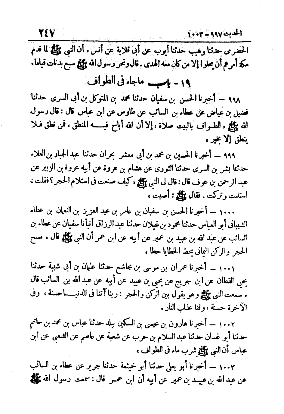 1002- أَخْبَرَنَا هَارُونُ بْنُ عِيسَى بْنِ السُّكَيْنِ بِبَلَدٍ حَدثنَا عَبَّاس بن مُحَمَّد بن حَاتِم حَدثنَا أَبُو غَسَّان حَدَّثَنَا عَبْدُ السَّلامِ بْنُ حَرْبٍ عَنْ شُعْبَةَ عَنْ عَاصِمٍ عَنِ الشَّعْبِيِّ عَنِ ابْنِ عَبَّاسٍ أَنَّ النَّبِيَّ صَلَّى اللهُ عَلَيْهِ وَسَلَّمَ شَرِبَ مَاء فِي الطّواف.