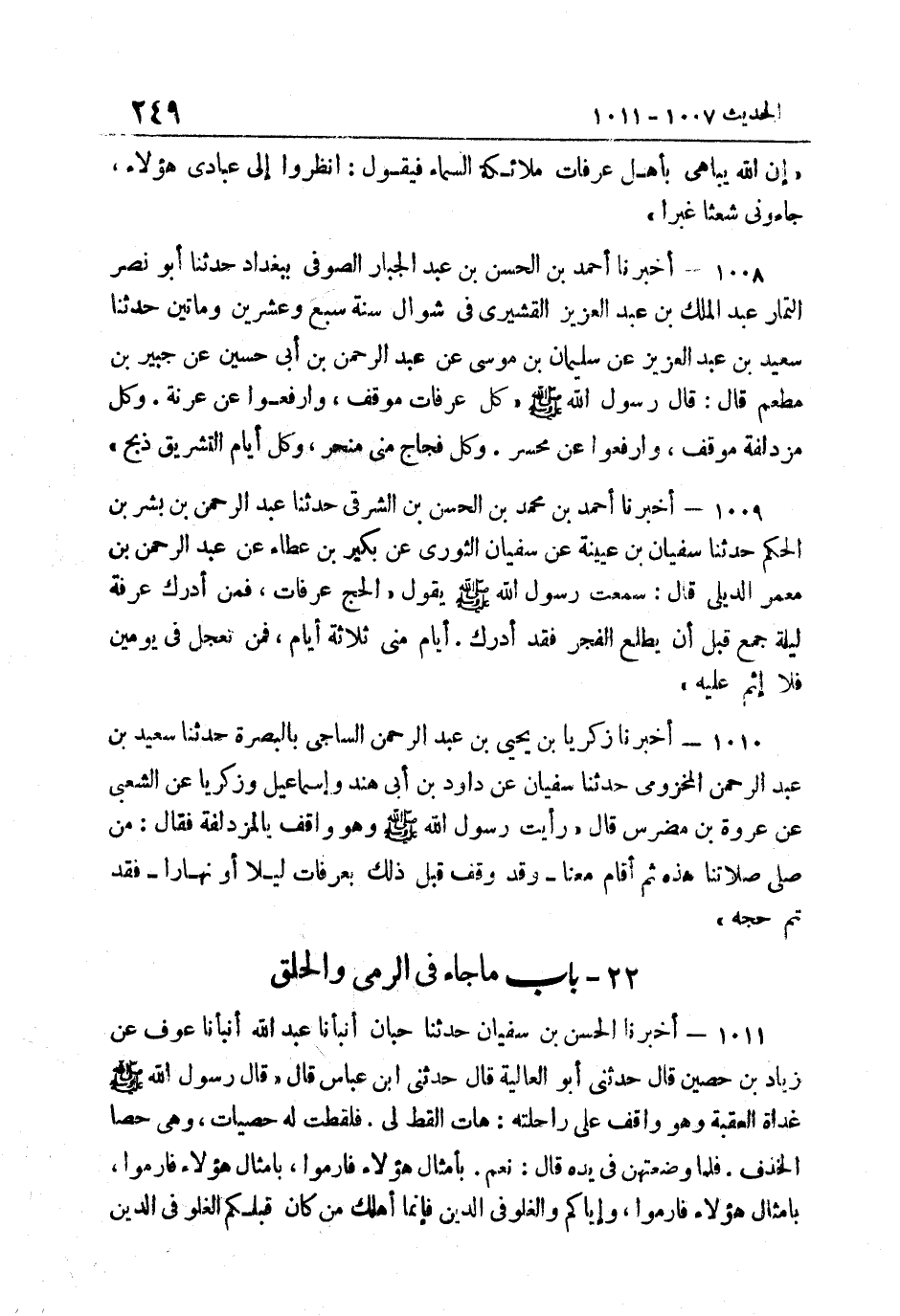 1009- أَخْبَرَنَا أَحْمَدُ بْنُ مُحَمَّدِ بْنِ الْحَسَنِ بْنِ الشَّرْقِيِّ حَدَّثَنَا عَبْدُ الرَّحْمَنِ بْنُ بِشْرِ بْنِ الْحَكَمِ حَدَّثَنَا سُفِيانُ بْنُ عُيَيْنَةَ عَنْ سُفِيانَ الثَّوْرِيِّ عَنْ بُكَيْرِ بْنِ عَطَاءٍ عَنْ عَبْدِ الرَّحْمَن بن معمر الدِّيلِيِّ قَالَ سَمِعْتُ رَسُولَ اللَّهِ صَلَّى اللهُ عَلَيْهِ وَسَلَّمَ يَقُولُ: "الْحَجُّ عَرَفَاتٌ فَمَنْ أَدْرَكَ عَرَفَةَ لَيْلَةَ جَمْعٍ قَبْلَ أَنْ يَطْلُعَ الْفَجْرُ فَقَدْ أَدْرَكَ أَيَّامُ مِنًى ثَلاثَةُ أَيَّامٍ فَمَنْ تعجل فِي يَوْمَيْنِ فَلَا إِثْم عَلَيْهِ".