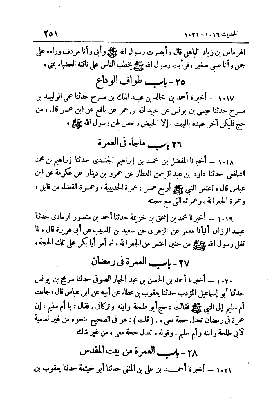 1018- أَخْبَرَنَا الْمُفَضَّلُ بْنُ مُحَمَّدِ بْنِ إِبْرَاهِيمَ الْجَنَدِيُّ حَدثنَا إِبْرَاهِيم بن مُحَمَّد الشَّافِعِي حَدَّثَنَا دَاوُدُ بْنُ عَبْدِ الرَّحْمَنِ الْعَطَّارُ عَنْ عَمْرِو بْنِ دِينَارٍ عَنْ عِكْرِمَةَ عَنِ ابْنِ عَبَّاسٍ قَالَ اعْتَمَرَ النَّبِيُّ صَلَّى اللهُ عَلَيْهِ وَسَلَّمَ أَرْبَعَ عُمَرٍ عُمْرَةَ الْحُدَيْبِيَةِ وَعُمْرَةَ الْقَضَاءِ مِنْ قَابِلٍ وَعُمْرَةَ الْجِعْرَانَةَ وَعُمْرَتَهُ الَّتِي مَعَ حجَّته.