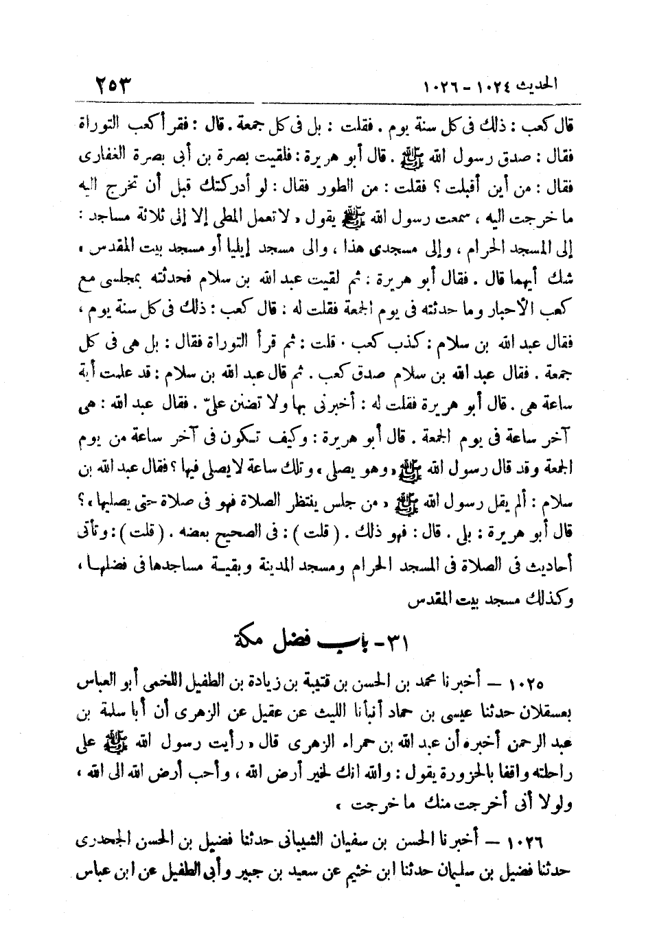 قَالَ كَعْبٌ ذَلِكَ فِي كُلِّ سَنَةٍ يَوْمٌ فَقُلْتُ بَلْ فِي كُلِّ جُمُعَةٍ قَالَ فَقَرَأَ كَعْبٌ التَّوْرَاةَ فَقَالَ صَدَقَ رَسُولُ اللَّهِ صَلَّى اللهُ عَلَيْهِ وَسَلَّمَ قَالَ أَبُو هُرَيْرَةَ فَلَقِيتُ بَصْرَةَ بْنَ أَبِي بَصْرَةَ الْغِفَارِيَّ فَقَالَ مِنْ أَيْنَ أَقْبَلْتَ فَقُلْتُ مِنَ الطُّورِ فَقَالَ لَوْ أَدْرَكتك قبل أَن تخرج إِلَيْهِ مَا خَرَجْتَ إِلَيْهِ سَمِعْتُ رَسُولَ اللَّهِ صَلَّى اللهُ عَلَيْهِ وَسَلَّمَ يَقُولُ: "لَا تُعْمَلُ الْمَطِيُّ إِلا إِلَى ثَلاثَةِ مَسَاجِدَ إِلَى الْمَسْجِدِ الْحَرَامِ وَإِلَى مَسْجِدي هَذَا وَإِلَى مَسْجِد إيليا أَوْ مَسْجِدِ بَيْتِ الْمَقْدِسِ" شَكَّ أَيُّهُمَا قَالَ فَقَالَ أَبُو هُرَيْرَةَ ثُمَّ لَقِيتُ عَبْدَ اللَّهِ بْنَ سَلامٍ فَحَدَّثْتُهُ بِمَجْلِسِي مَعَ كَعْبِ الأَحْبَارِ وَمَا حَدَّثَتْهُ فِي يَوْمِ الْجُمُعَةِ فَقُلْتُ لَهُ قَالَ كَعْب ذَلِك فِي كُلِّ سَنَةٍ يَوْمٌ فَقَالَ عَبْدُ اللَّهِ بْنُ سَلامٍ كَذَبَ كَعْبٌ قُلْتُ ثُمَّ قَرَأَ التَّوْرَاةَ فَقَالَ بَلْ هِيَ فِي كُلِّ جُمُعَةٍ فَقَالَ عَبْدُ اللَّهِ بْنُ سَلامٍ صَدَقَ كَعْبٌ ثُمّ قَالَ عَبْدُ اللَّهِ بْنُ سَلامٍ قَدْ علمت أَيَّة سَاعَة هِيَ قَالَ أَبُو هُرَيْرَة فَقلت لَهُ أَخْبرنِي بِهَا وَلا تَضِنَّنَ عَلَيَّ فَقَالَ عَبْدُ اللَّهِ هِيَ آخِرُ سَاعَةٍ فِي يَوْمِ الْجُمُعَةِ قَالَ أَبُو هُرَيْرَة وَكَيف تكون فِي آخِرَ سَاعَةٍ مِنْ يَوْمِ الْجُمُعَةِ وَقَدْ قَالَ رَسُولُ اللَّهِ صَلَّى اللهُ عَلَيْهِ وَسَلَّمَ وَهُوَ يُصَلِّي: "وَتِلْكَ سَاعَةٌ لَا يُصَلَّى فِيهَا" فَقَالَ عَبْدُ اللَّهِ بْنُ سَلامٍ أَلَمْ يَقُلْ رَسُولُ اللَّهِ صَلَّى اللهُ عَلَيْهِ وَسَلَّمَ: "مَنْ جَلَسَ يَنْتَظِرُ الصَّلاةَ فَهُوَ فِي صَلاةٍ حَتَّى يُصَلِّيَهَا" قَالَ أَبُو هُرَيْرَة بلَى قَالَ فَهُوَ ذَلِك قلت فِي الصَّحِيح بعضه قلت وَتَأْتِي أَحَادِيث فِي الصَّلَاة فِي الْمَسْجِد الْحَرَام وَمَسْجِد الْمَدِينَة وَبَقِيَّة مساجدها فِي فَضلهَا وَكَذَلِكَ مَسْجِد بَيت الْمُقَدّس.