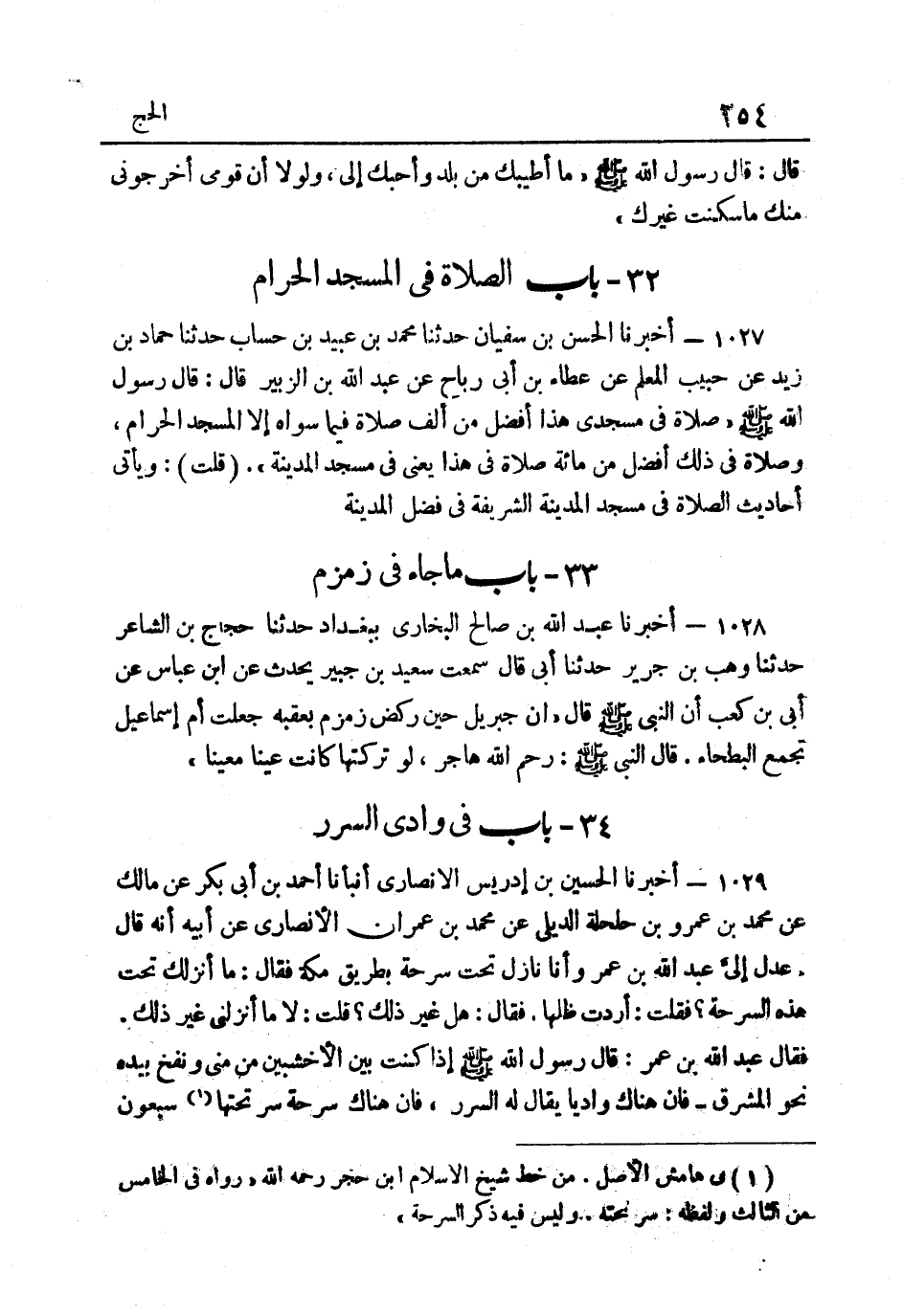 1027- أَخْبَرَنَا الْحَسَنُ بْنُ سُفْيَانَ حَدَّثَنَا مُحَمَّدُ بْنُ عُبَيْدِ بْنِ حِسَابٍ حَدَّثَنَا حَمَّادُ بْنُ زَيْدٍ عَنْ حَبِيبٍ الْمُعَلِّمِ عَنْ عَطَاءِ بْنِ أَبِي رَبَاحٍ عَنْ عَبْدِ اللَّهِ بْنِ الزُّبَيْرِ قَالَ قَالَ رَسُولُ اللَّهِ صَلَّى اللهُ عَلَيْهِ وَسَلَّمَ: "صَلاةٌ فِي مَسْجِدِي هَذَا أَفْضَلُ مِنْ أَلْفِ صَلاةٍ فِيمَا سِوَاهُ إِلا الْمَسْجِدَ الْحَرَامَ وَصَلاةٌ فِي ذَلِك أَفْضَلُ مِنْ مِائَةِ صَلاةٍ فِي هَذَا يَعْنِي فِي مَسْجِد الْمَدِينَة" قلت وَيَأْتِي أَحَادِيث الصَّلَاة فِي مَسْجِد الْمَدِينَة الشَّرِيفَة فِي فضل الْمَدِينَة.