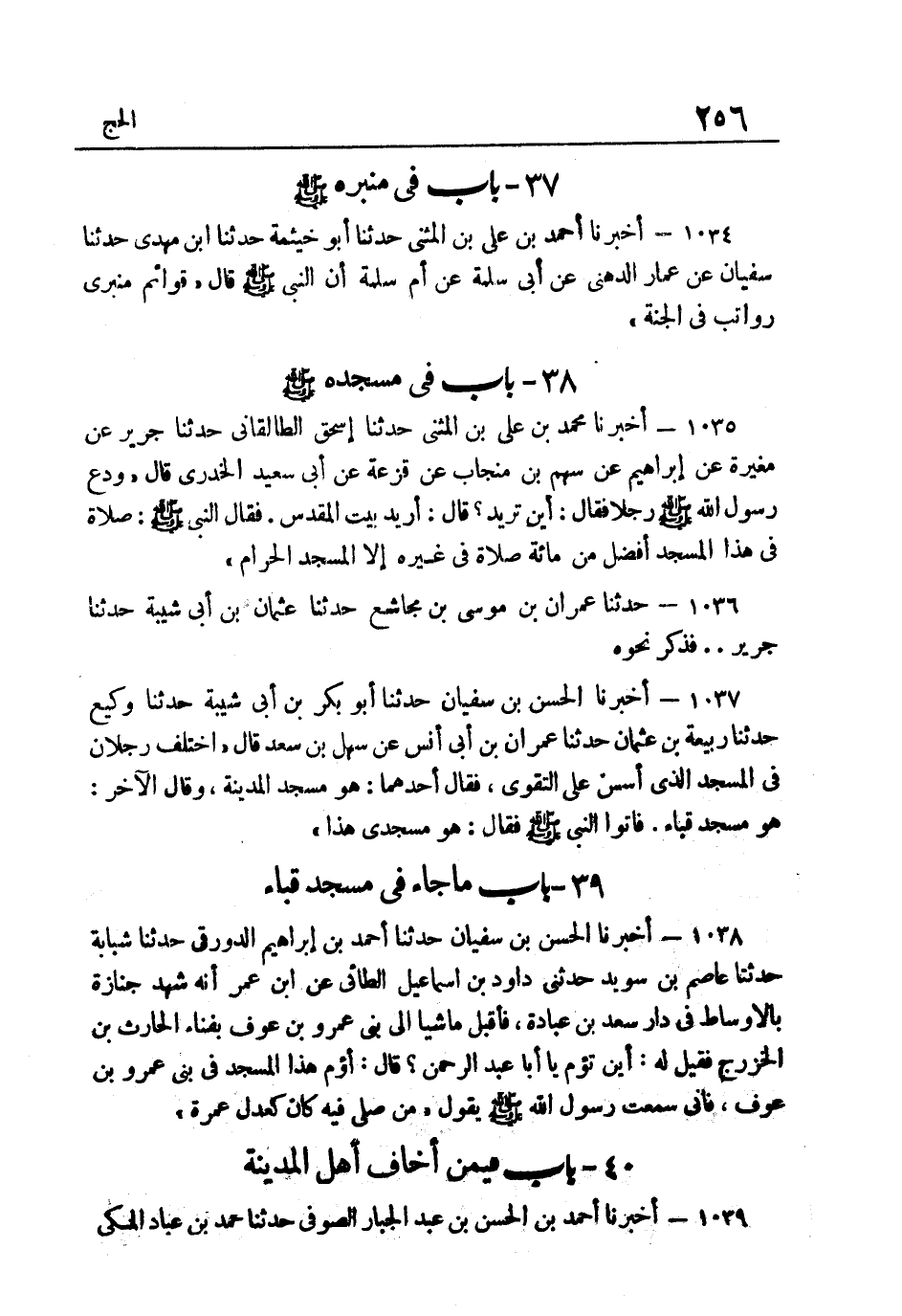 1038- أَخْبَرَنَا الْحَسَنُ بْنُ سُفْيَانَ حَدَّثَنَا أَحْمَدُ بْنُ إِبْرَاهِيمَ الدَّوْرَقِيُّ حَدَّثَنَا شَبَابَةُ حَدَّثَنَا عَاصِمُ بْنُ سُوَيْد حَدثنِي دَاوُد بن إِسْمَاعِيل الطَّائِي عَنِ ابْنِ عُمَرَ أَنَّهُ شَهِدَ جَنَازَةً بِالأَوْسَاطِ فِي دَارِ سَعْدِ بْنِ عُبَادَةَ فَأَقْبَلَ مَاشِيًا إِلَى بني عَمْرو بن عَوْف بِفنَاء الْحَارِثِ بْنِ الْخَزْرَجِ فَقِيلَ لَهُ أَيْنَ تَؤُمُّ يَا أَبَا عَبْدِ الرَّحْمَنِ قَالَ أَؤُمُّ هَذَا الْمَسْجِدَ فِي بَنِي عَمْرِو بْنِ عَوْفٍ فَإِنِّي سَمِعت رَسُول الله صَلَّى اللهُ عَلَيْهِ وَسَلَّمَ يَقُولُ: "مَنْ صَلَّى فِيهِ كَانَ كَعَدْلِ عَمْرَةٍ".