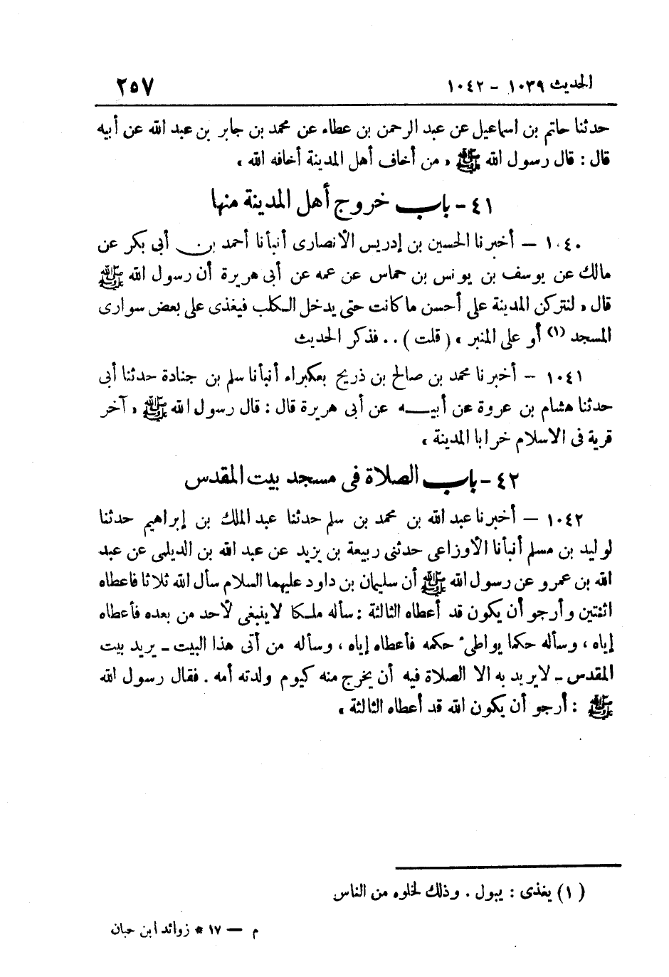 1041- أَخْبَرَنَا مُحَمَّدُ بْنُ صَالِحِ بْنِ ذَرِيحٍ بِعُكْبَرَاءَ أَنبأَنَا سلم بن جُنَادَة حَدَّثَنَا أَبِي حَدَّثَنَا هِشَامُ بْنُ عُرْوَةَ عَنْ أَبِيهِ عَنْ أَبِي هُرَيْرَةَ قَالَ قَالَ رَسُولُ اللَّهِ صَلَّى اللهُ عَلَيْهِ وَسَلَّمَ: "آخِرُ قَرْيَةٍ فِي الإِِسْلامِ خرابا الْمَدِينَة".