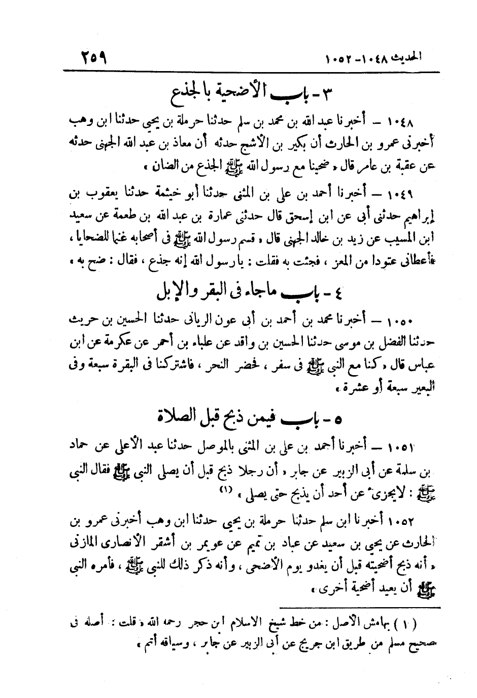1051- أَخْبَرَنَا أَحْمَدُ بْنُ عَلِيِّ بْنِ الْمُثَنَّى بِالْمَوْصِلِ حَدثنَا عبد الْأَعْلَى عَنْ حَمَّادِ بْنِ سَلَمَةَ عَنْ أَبِي الزُّبَيْرِ عَنْ جَابِرٍ أَنَّ رَجُلا ذَبَحَ قَبْلَ أَنْ يُصَلِّيَ النَّبِيِّ صَلَّى اللهُ عَلَيْهِ وَسَلَّمَ فَقَالَ النَّبِيُّ صَلَّى اللهُ عَلَيْهِ وَسَلَّمَ: "لَا يجزىء عَن أحد يذبح حَتَّى يُصَلِّي" 1.