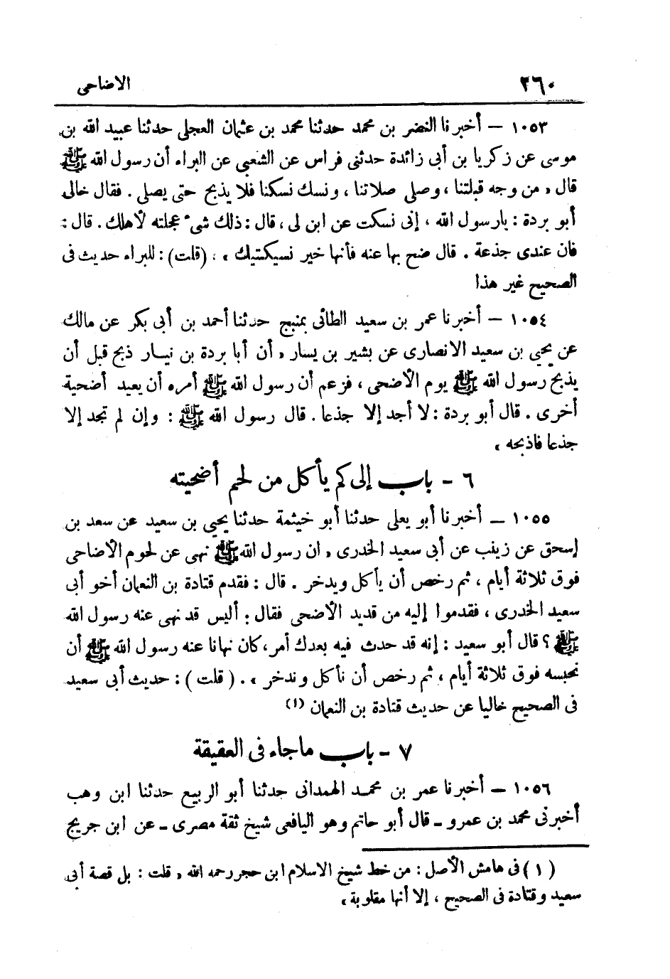 1053- أَخْبَرَنَا النَّضْرُ بْنُ مُحَمَّدٍ حَدَّثَنَا مُحَمَّدُ بْنُ عُثْمَانَ الْعِجْلِيُّ حَدَّثَنَا عُبَيْدُ اللَّهِ بْنُ مُوسَى عَنْ زَكَرِيَّا بْنِ أَبِي زَائِدَةَ حَدَّثَنِي فِرَاسٌ عَن الشّعبِيّ عَنِ الْبَرَاءِ أَنّ رَسُولَ اللَّهِ صَلَّى اللهُ عَلَيْهِ وَسَلَّمَ قَالَ: "مَنْ وَجَّهَ قِبْلَتَنَا وَصَلَّى صَلاتَنَا وَنَسَكَ نُسُكَنَا فَلا يَذْبَحْ حَتَّى يُصَلِّيَ" فَقَالَ خَالِي أَبُو بُرْدَةَ يَا رَسُولَ اللَّهِ إِنِّي نَسَكْتُ عَن ابْن لي قَالَ: "ذَلِك شَيْءٌ عَجَّلْتَهُ لأَهْلِكَ" قَالَ فَإِنَّ عِنْدِيَ جَذَعَةً قَالَ: "ضح بهَا فَإِنَّهَا خير نسيكتيك" قلت للبراء حَدِيث فِي الصَّحِيح غير هَذَا.
