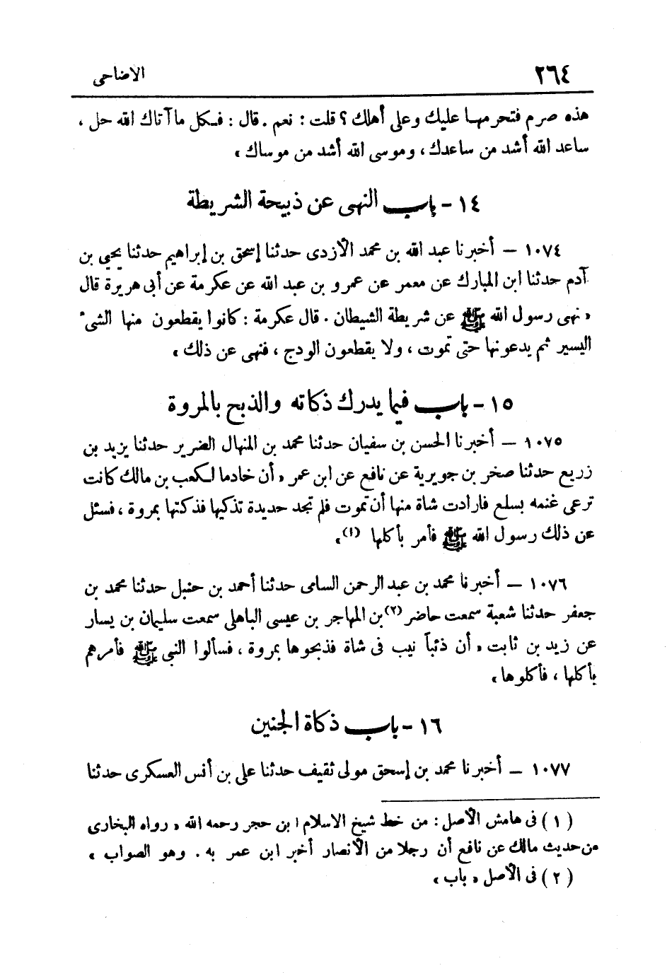1076- أَخْبَرَنَا مُحَمَّدُ بْنُ عَبْدِ الرَّحْمَنِ السَّامِيُّ حَدَّثَنَا أَحْمَدُ بْنُ حَنْبَلٍ حَدَّثَنَا مُحَمَّدُ بْنُ جَعْفَرٍ حَدثنَا شُعْبَة سَمِعت حَاضر2 بن المُهَاجر بن عِيسَى الْبَاهِلِيّ سَمِعت سُلَيْمَان بن يسَار عَنْ زَيْدِ بْنِ ثَابِتٍ أَنَّ ذِئْبًا نَيَّبَ فِي شَاةٍ فَذَبَحُوهَا بِمَرْوَةٍ فَسَأَلُوا النَّبِيَّ صَلَّى اللهُ عَلَيْهِ وَسَلَّمَ فَأَمرهمْ بأكلها فأكلوها.