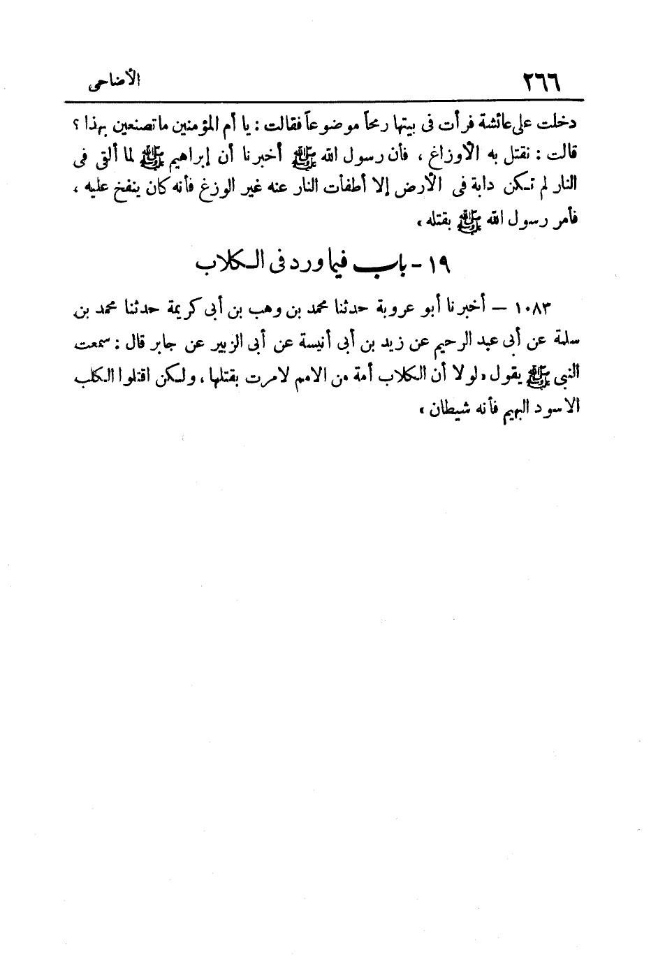 1083- أَخْبَرَنَا أَبُو عَرُوبَةَ حَدَّثَنَا مُحَمَّدُ بْنُ وَهْبِ بْنِ أَبِي كَرِيمَةَ حَدَّثَنَا مُحَمَّدُ بْنُ سَلَمَةَ عَنْ أَبِي عَبْدِ الرَّحِيمِ عَنْ زَيْدِ بْنِ أَبِي أُنَيْسَةَ عَنْ أَبِي الزُّبَيْرِ عَنْ جَابِرٍ قَالَ سَمِعْتُ النَّبِيَّ صَلَّى اللهُ عَلَيْهِ وَسَلَّمَ يَقُولُ: "لَوْلا أَنَّ الْكِلابَ أُمَّةٌ مِنَ الأُمَمِ لأَمَرْتُ بِقَتْلِهَا وَلَكِنِ اقْتُلُوا الْكَلْبَ الأَسْوَدَ الْبَهِيمَ فَإِنَّهُ شَيْطَان".