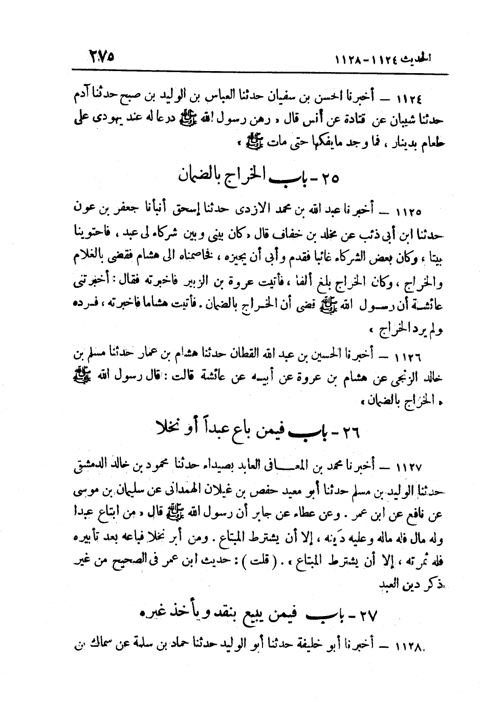1126- أَخْبَرَنَا الْحُسَيْنُ بْنُ عَبْدِ اللَّهِ الْقَطَّانُ حَدَّثَنَا هِشَامُ بْنُ عَمَّارٍ حَدَّثَنَا مُسْلِمُ بْنُ خَالِدٍ الزَّنْجِيُّ عَنْ هِشَامِ بْنِ عُرْوَةَ عَنْ أَبِيهِ عَنْ عَائِشَةَ قَالَتْ قَالَ رَسُولُ اللَّهِ صَلَّى اللهُ عَلَيْهِ وَسَلَّمَ: "الْخراج بِالضَّمَانِ".